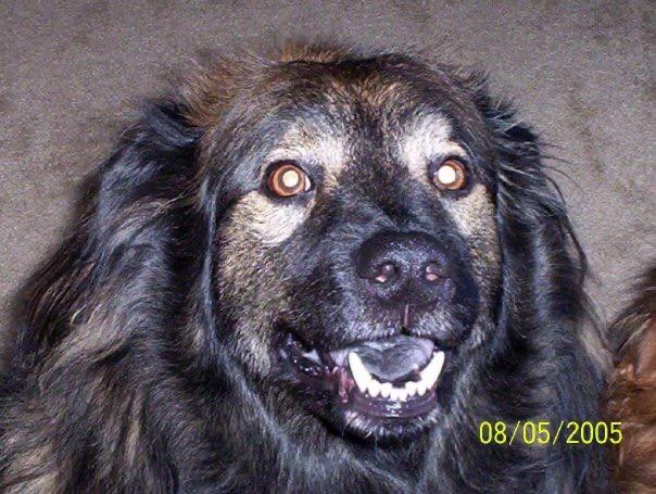Painting of a long-haired dark brown dog with amber eyes
