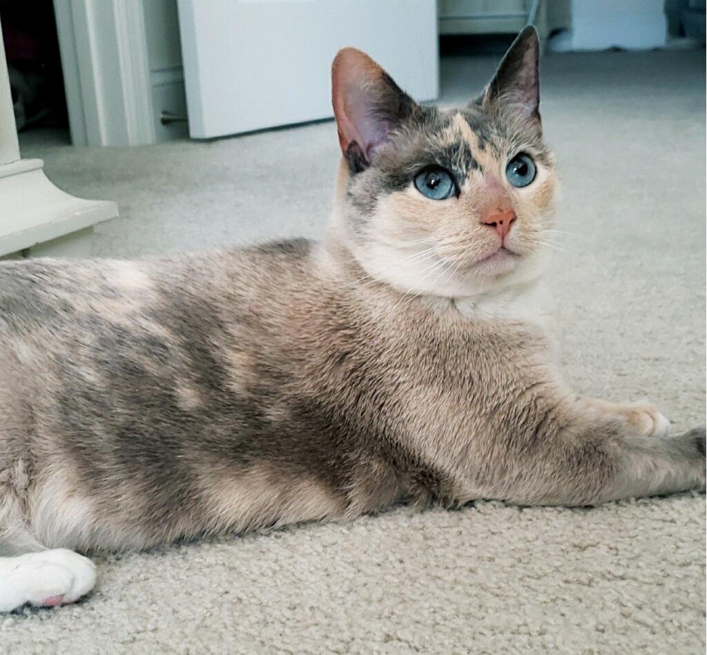 Painting of Foxy, a calico cat with blue eyes, lying down.