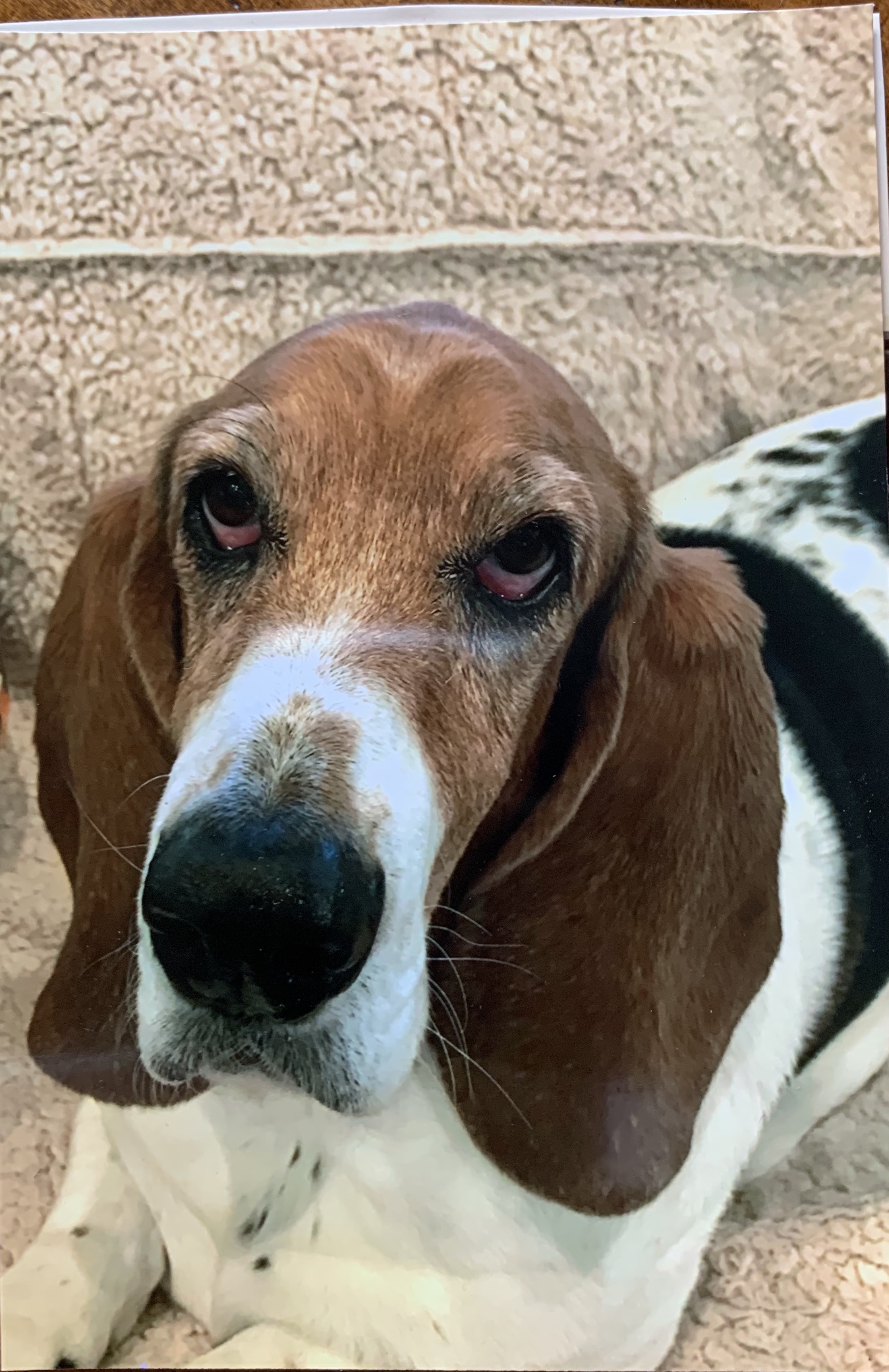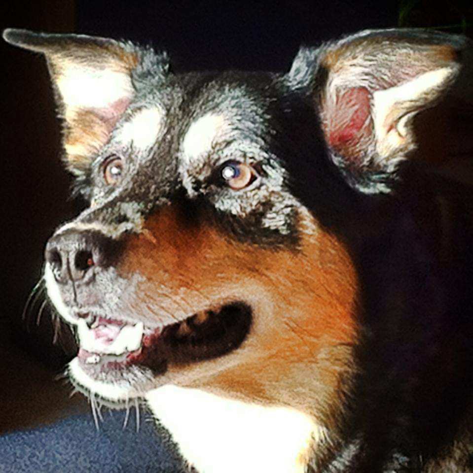 Painting of Kali, a tri-colored dog with dark grey, brown, and white fur.