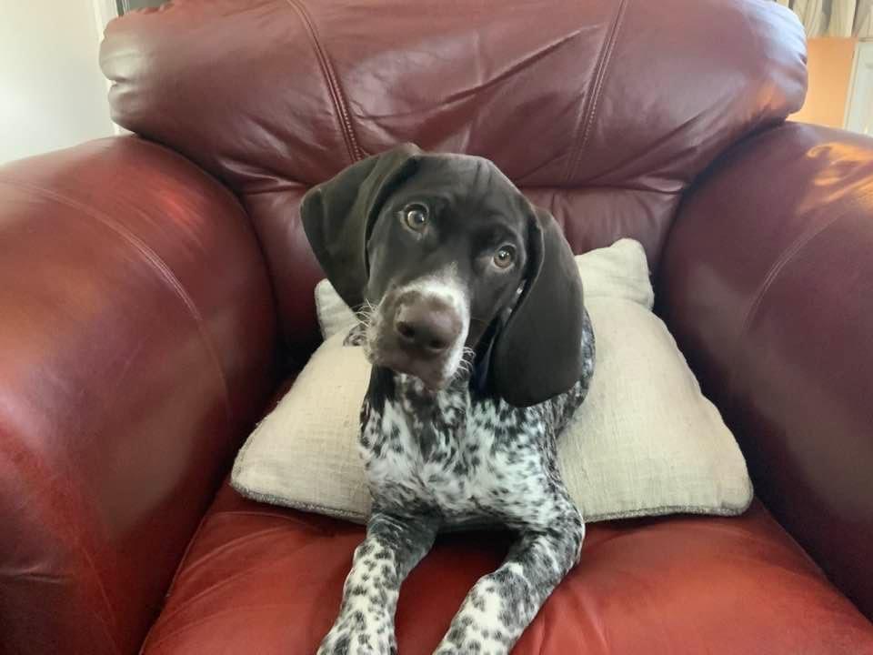 Painting of a German Shorthaired Pointer sitting on a red couch.