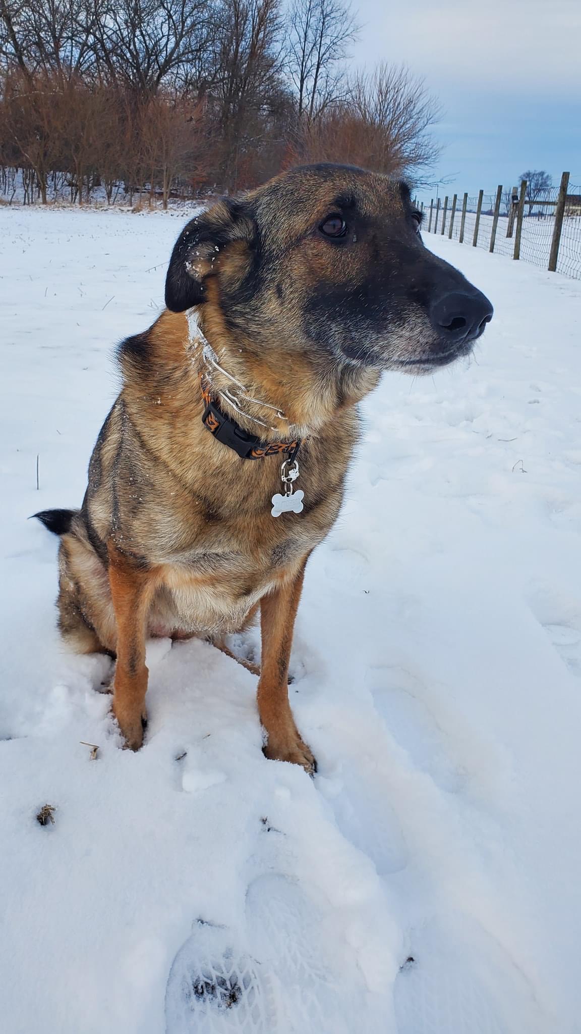 Painting of a brown and tan dog sitting in the snow