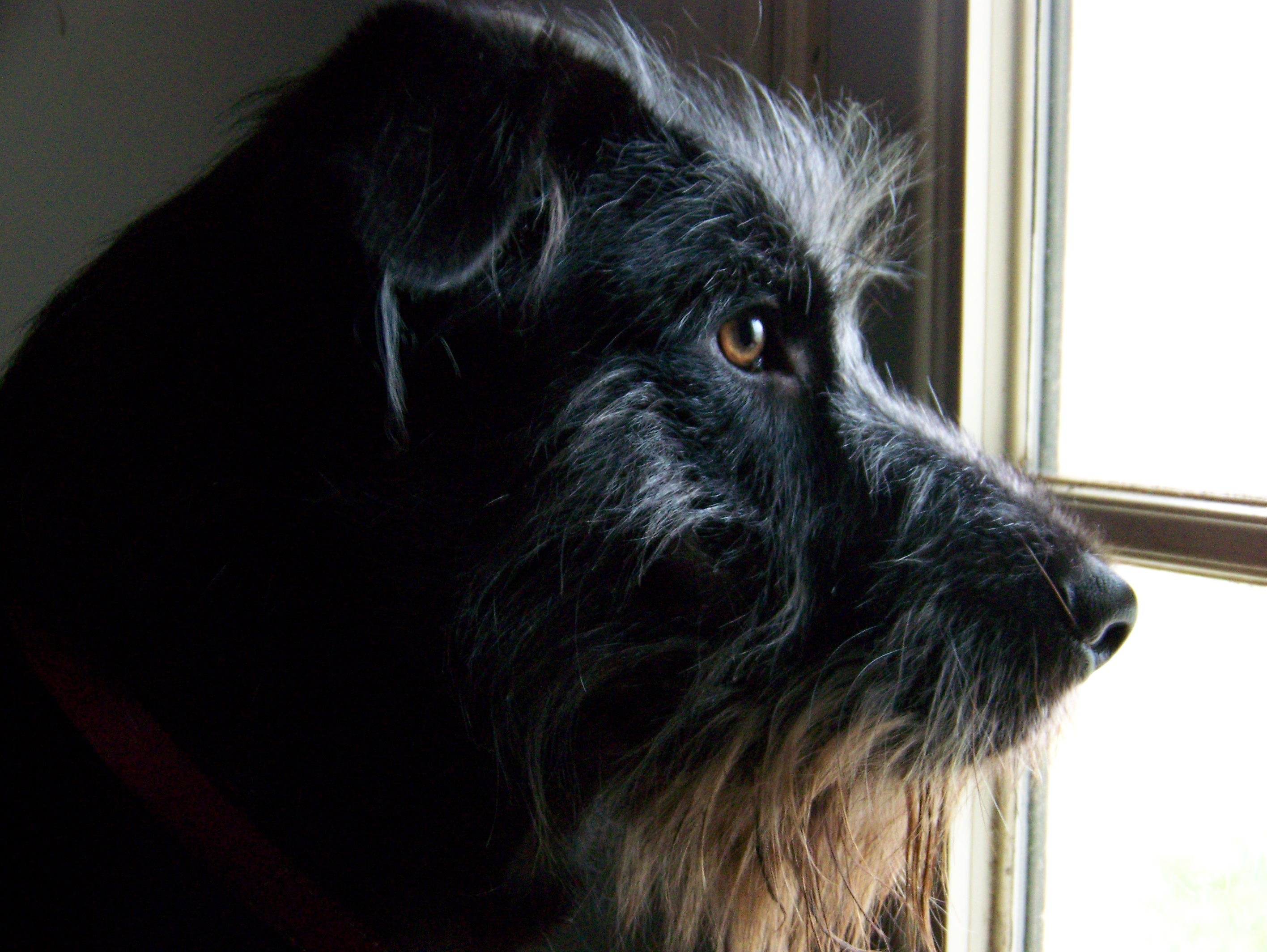 Oil painting of a black and gray dog in profile view.