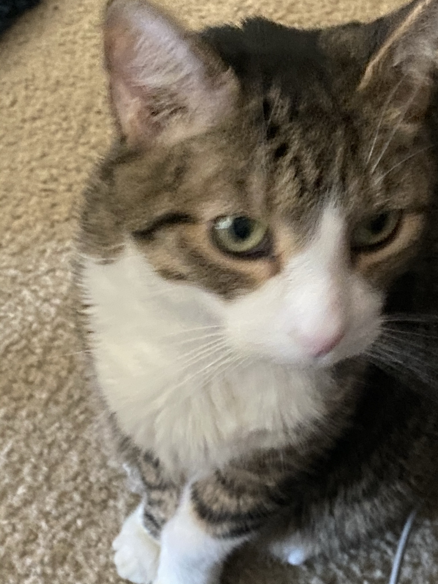 Painting of a gray tabby cat with green eyes looking at the viewer