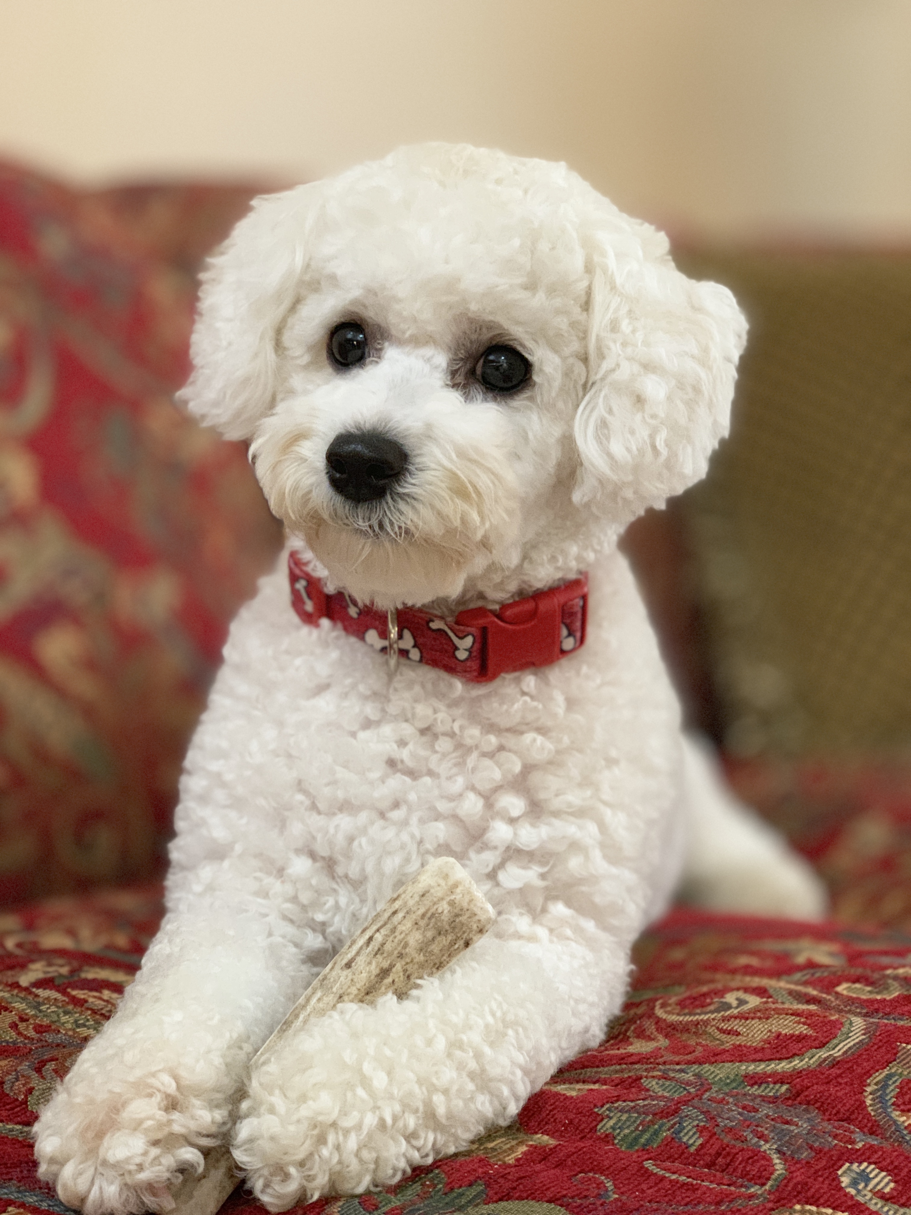 White bichon frise dog wearing red collar, lying on ornate chair.