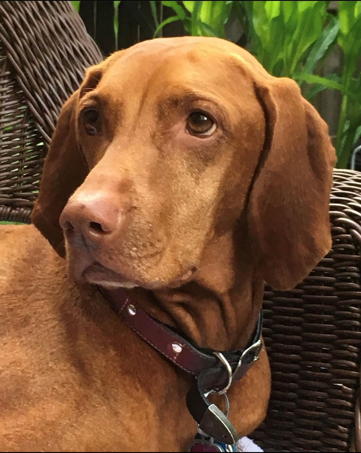 Painting of a Vizsla dog wearing a collar, looking to the left.