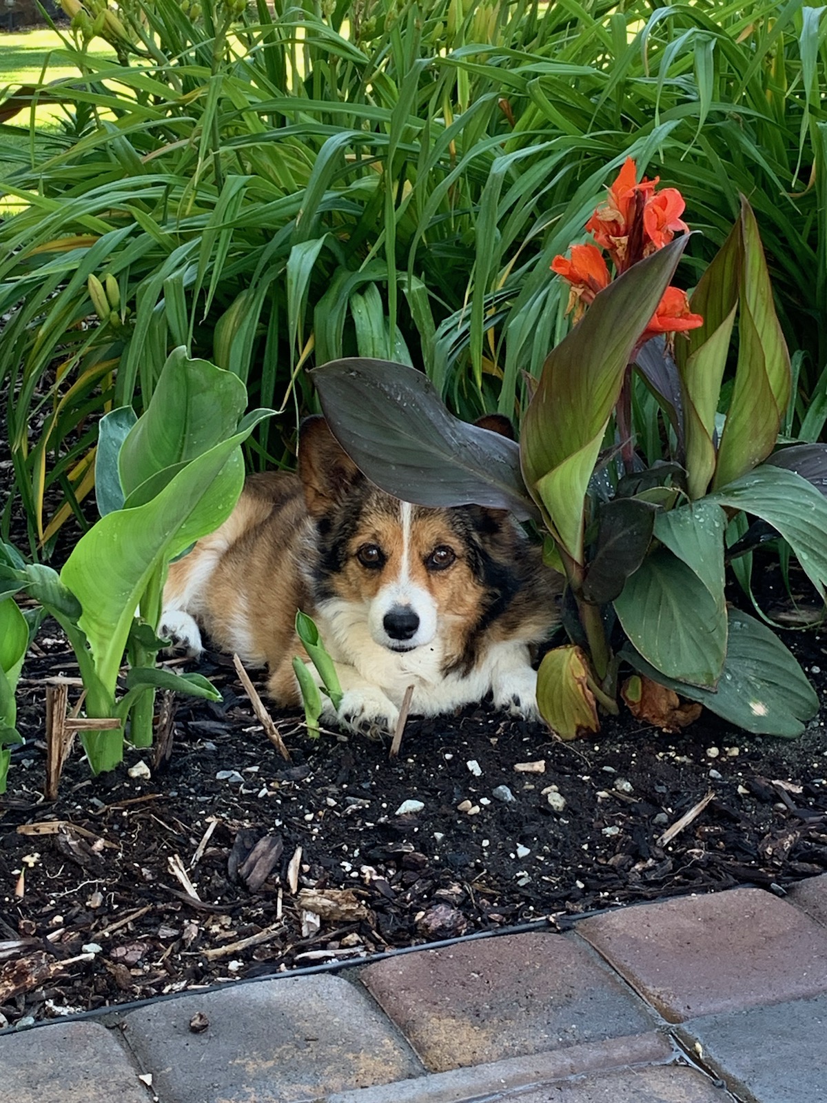 Painting of a corgi dog hiding in lush greenery.