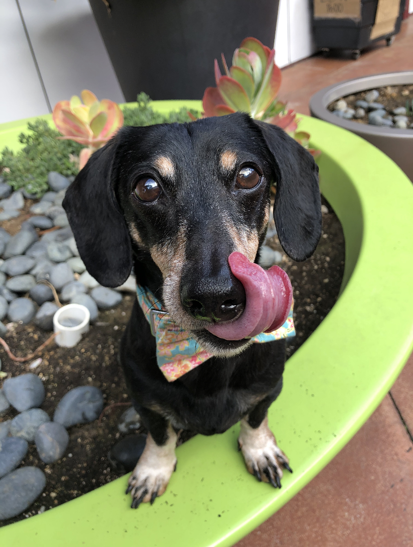 Painting of a dachshund with its tongue out, wearing a bandana, sitting in a green planter.