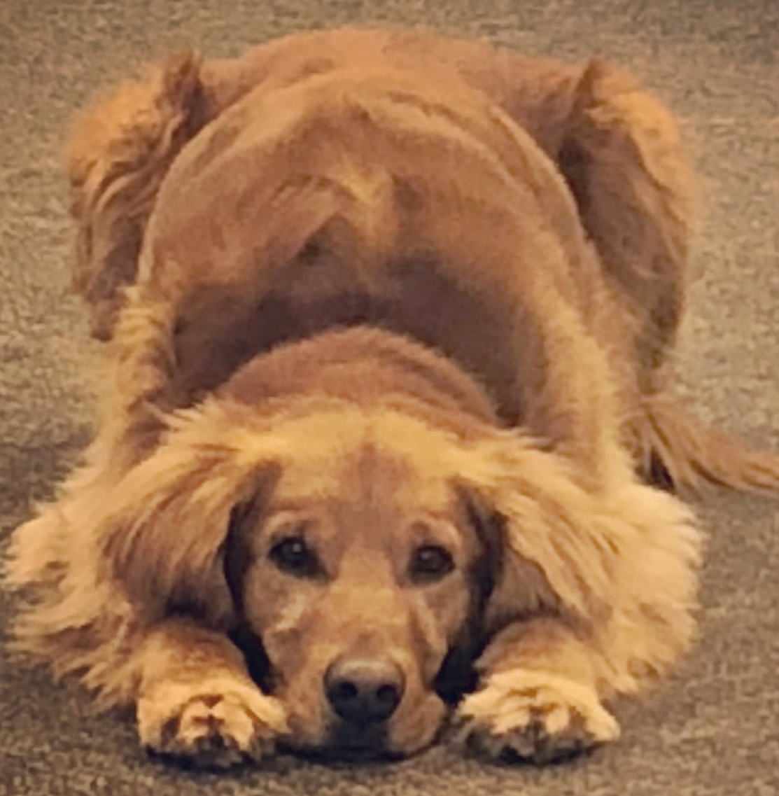 Painting of a golden retriever lying on green grass