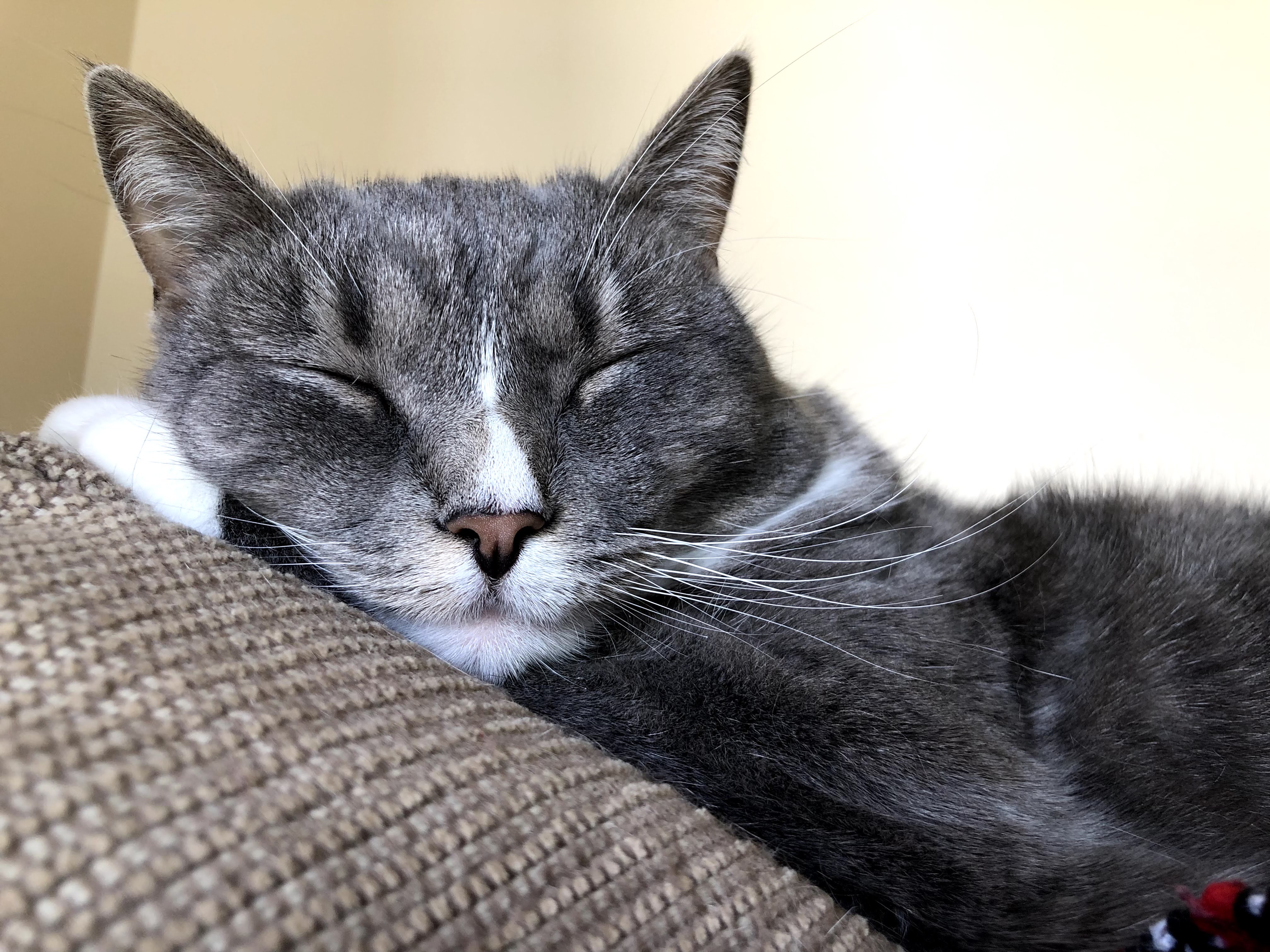 Gray and white cat lying down.