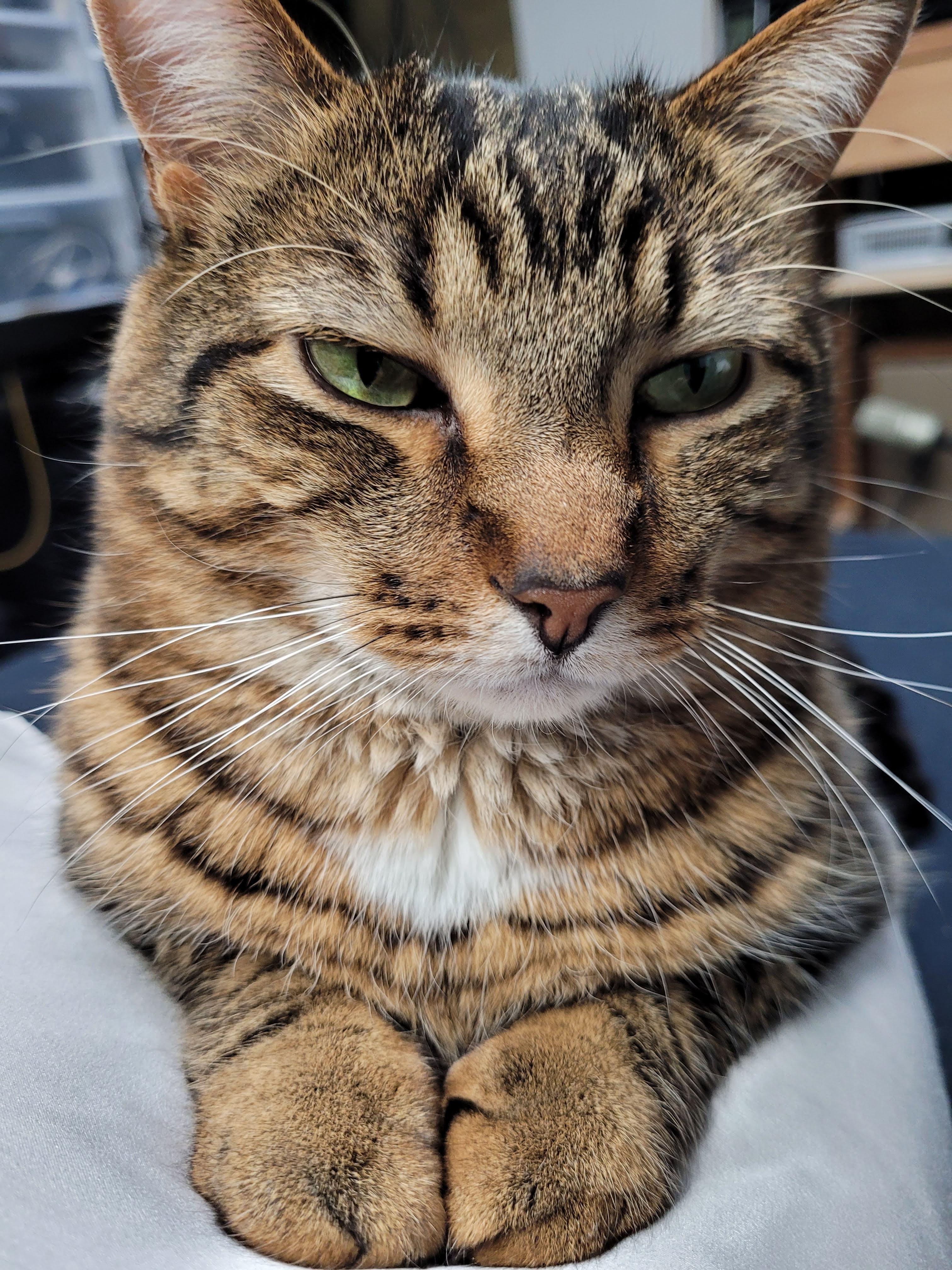 Painting of a tabby cat with green eyes