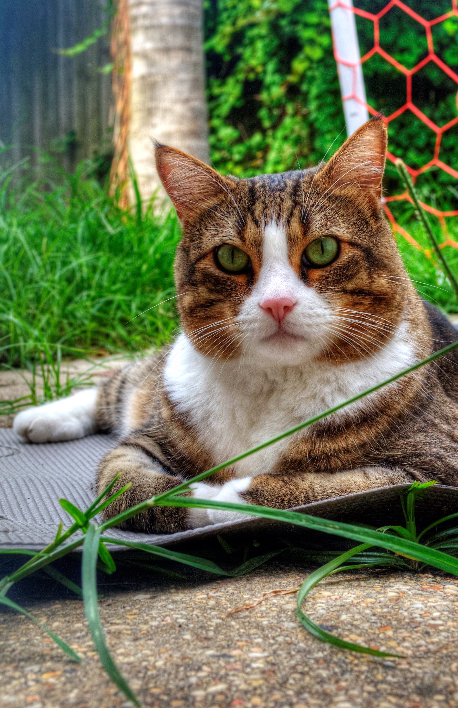 Painting of a tabby cat with green eyes lying in the grass