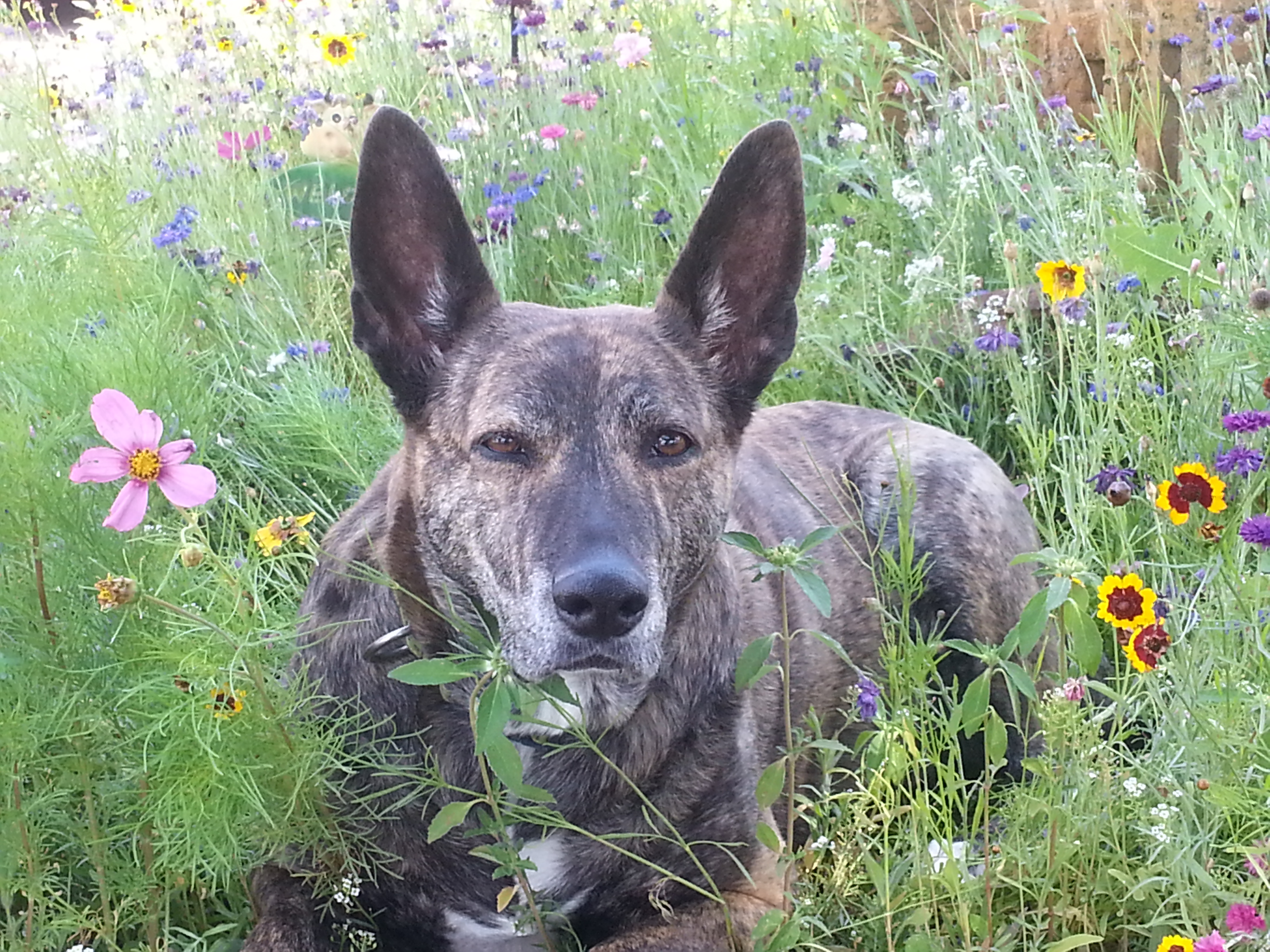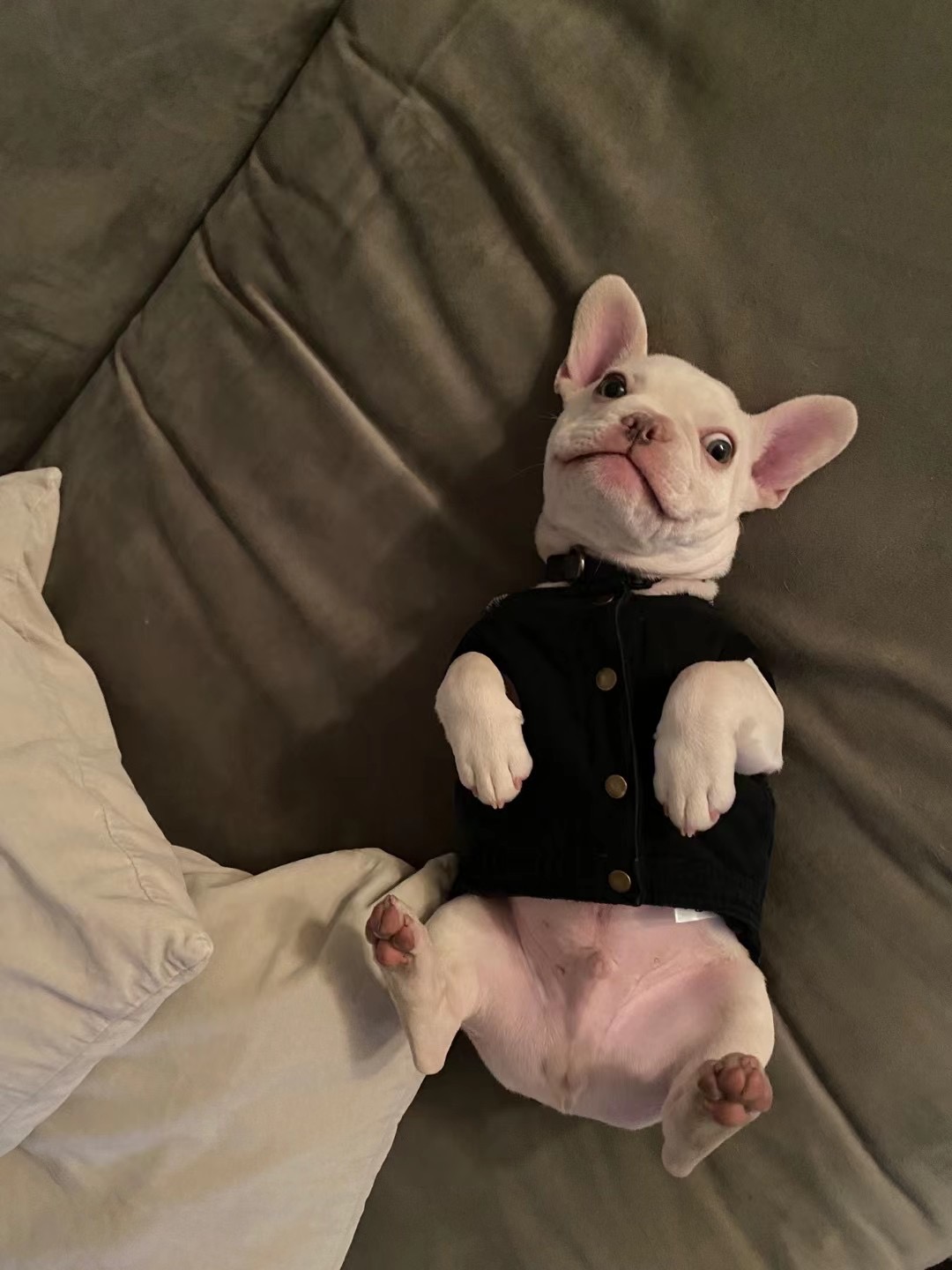 Painting of a white French bulldog wearing an orange harness with a bear-shaped patch, surrounded by pink flowers.