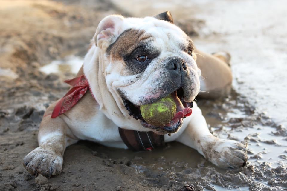 Painting of a bulldog with a red bandana holding a green ball in its mouth.