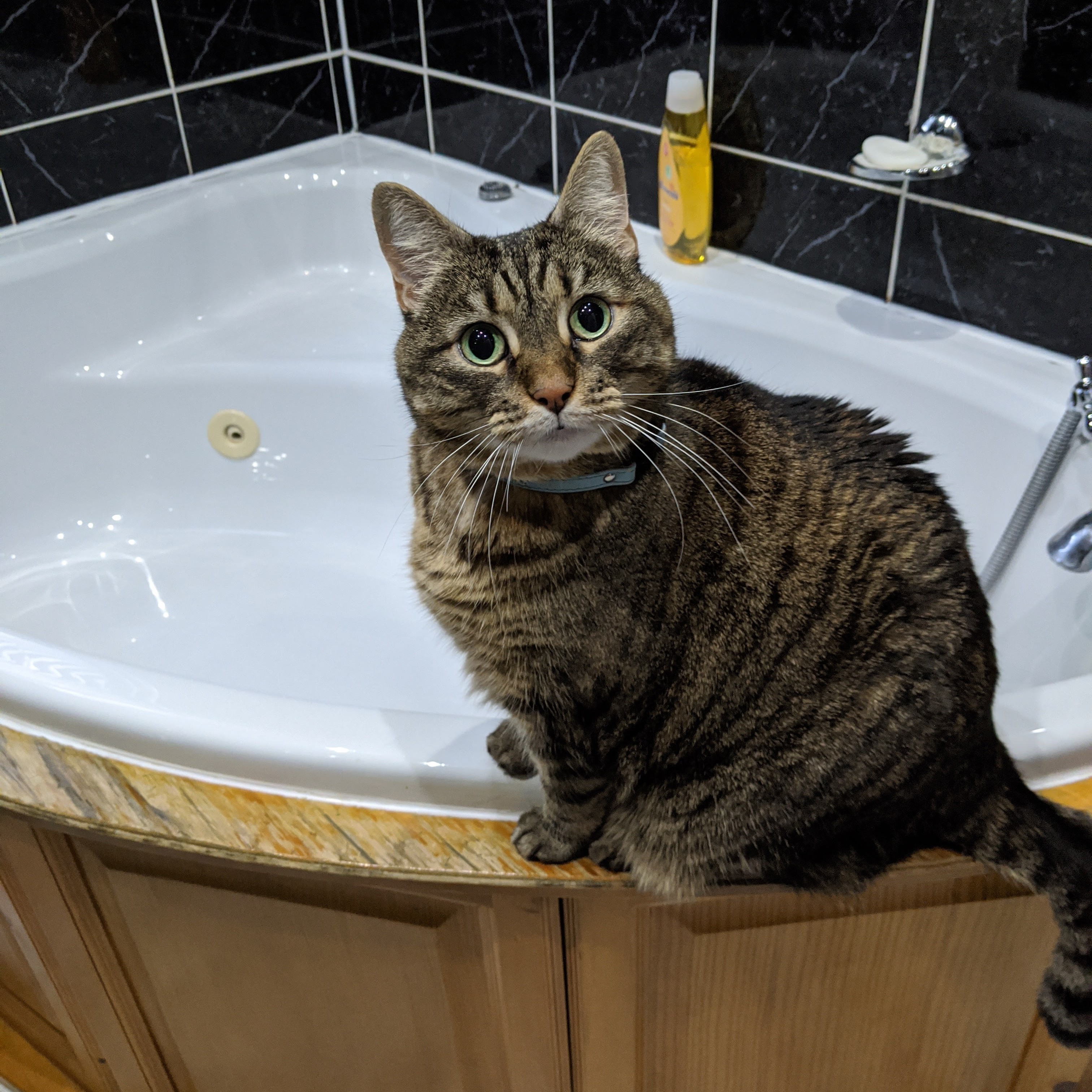 Painting of tabby cat sitting on edge of bathtub