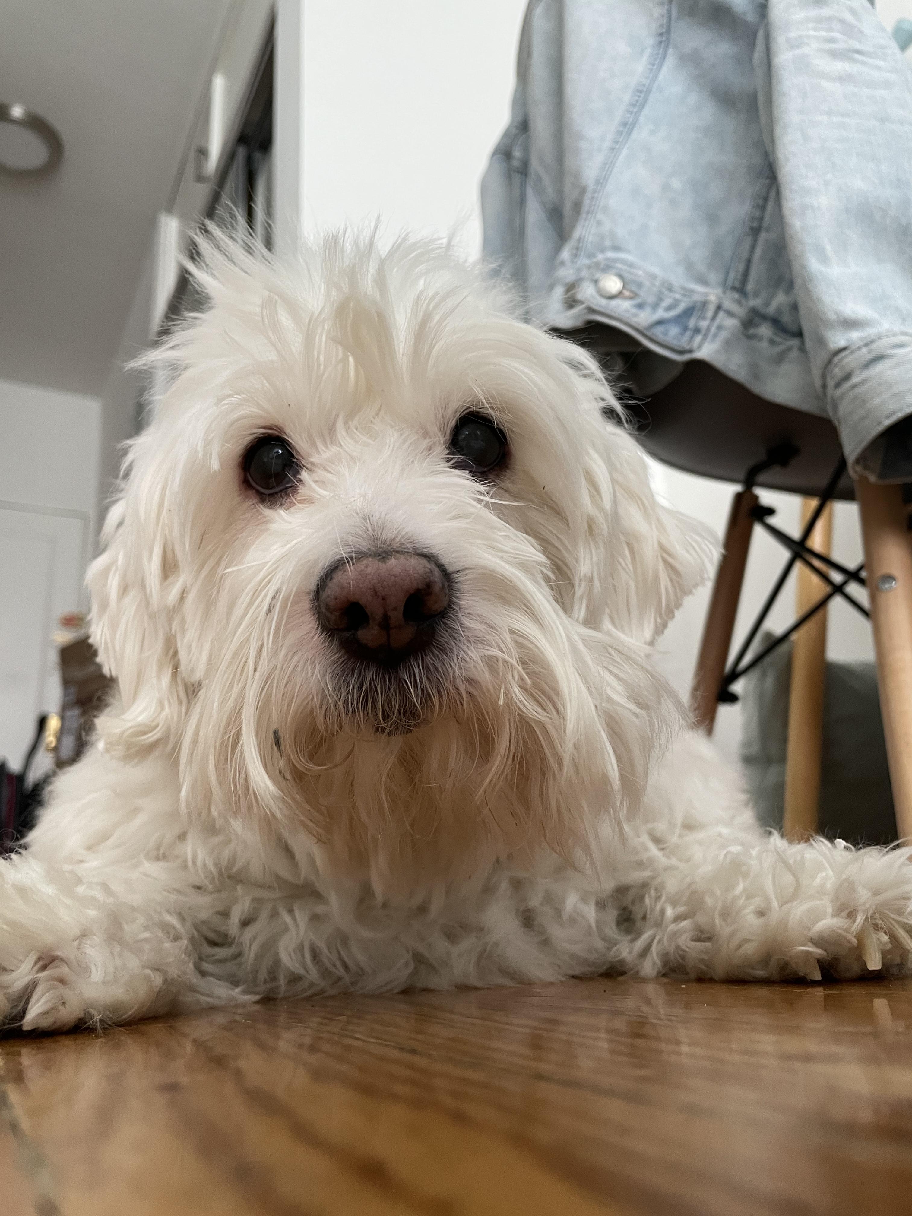 Painting of a West Highland White Terrier wearing a red dress, fur stole, and large feathered hat.