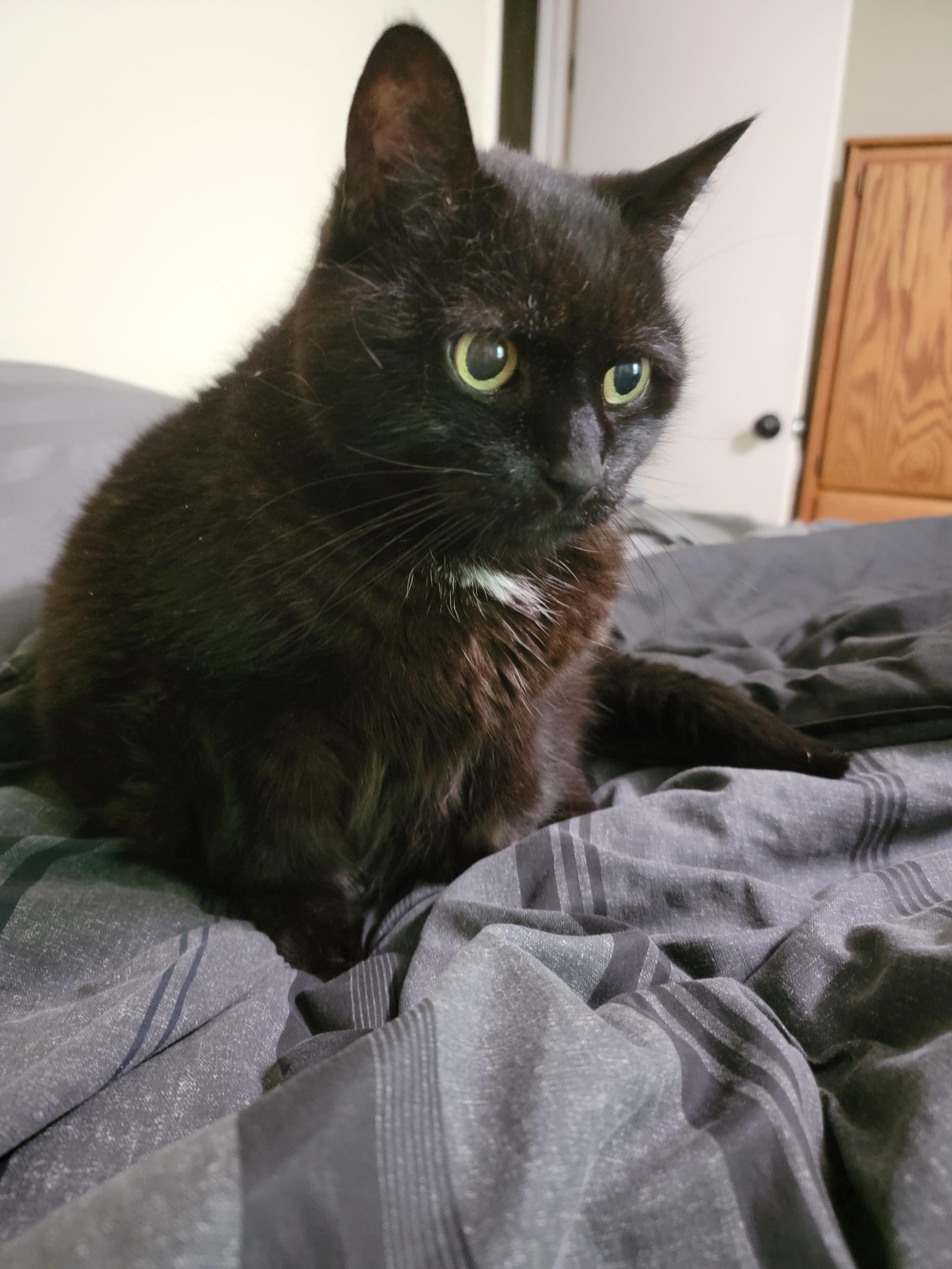 Painting of a black cat with yellow eyes
