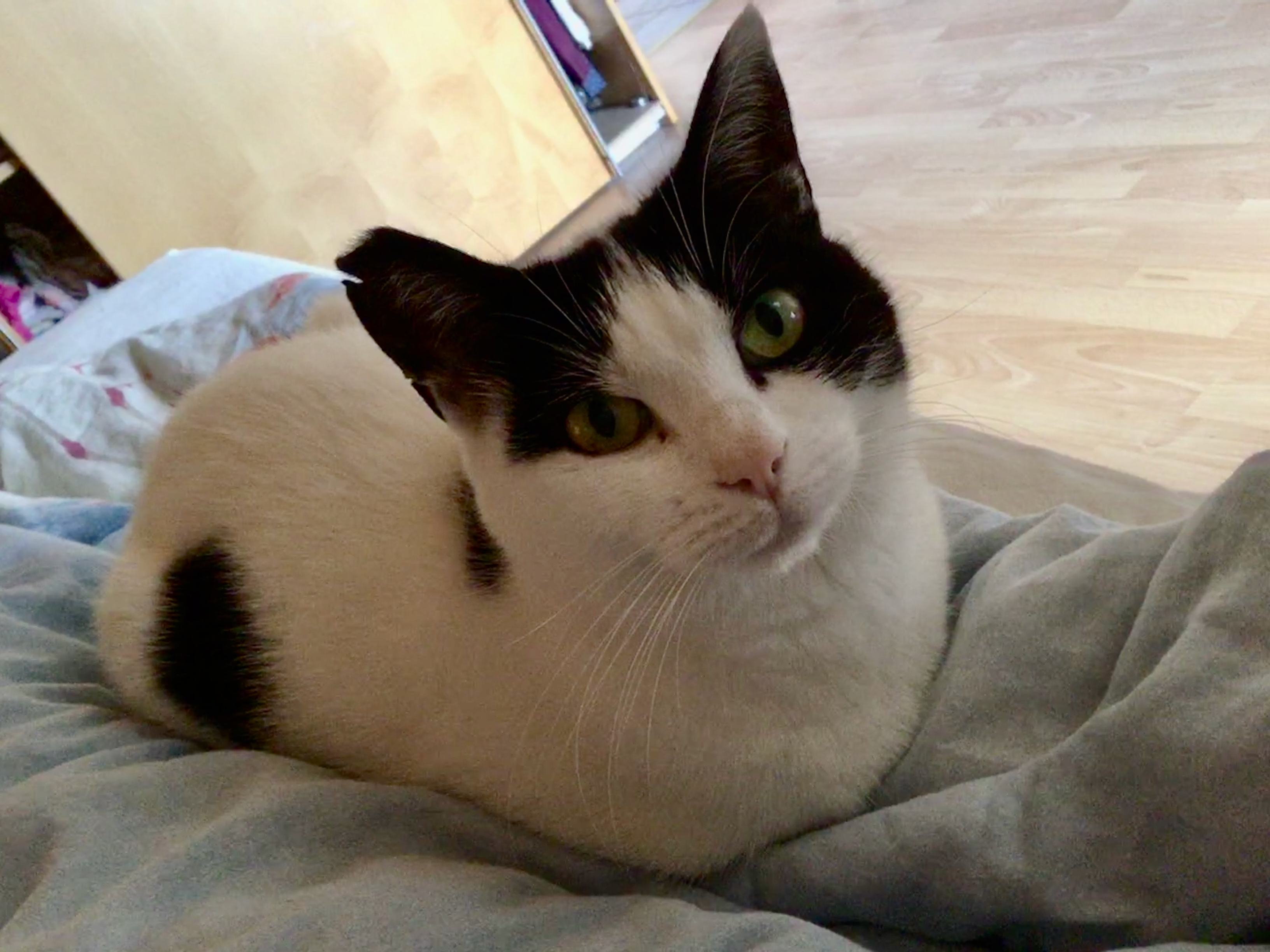 Painting of a tuxedo cat lying on a light blue surface