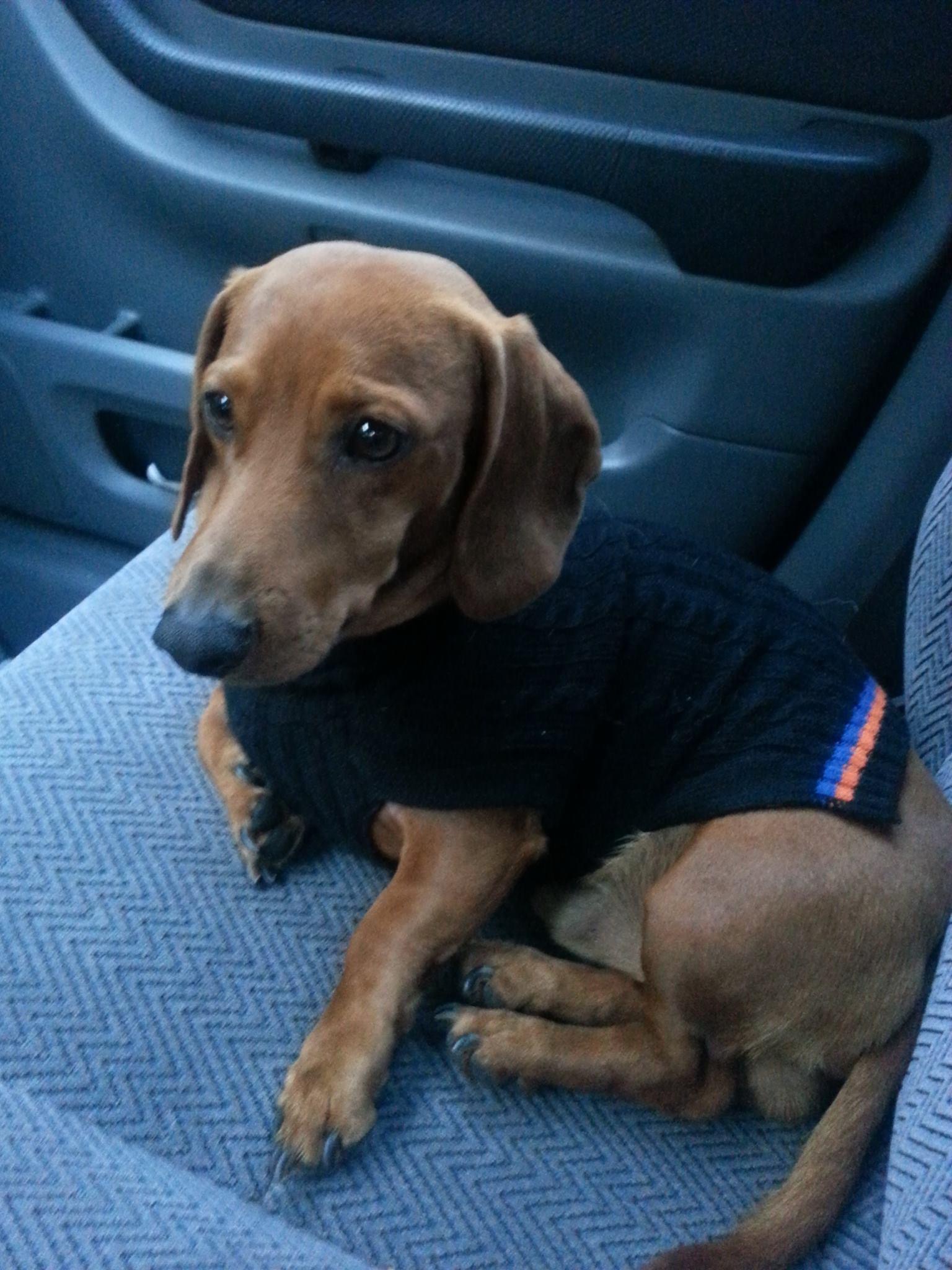 Painting of a dachshund wearing a dark blue collar.
