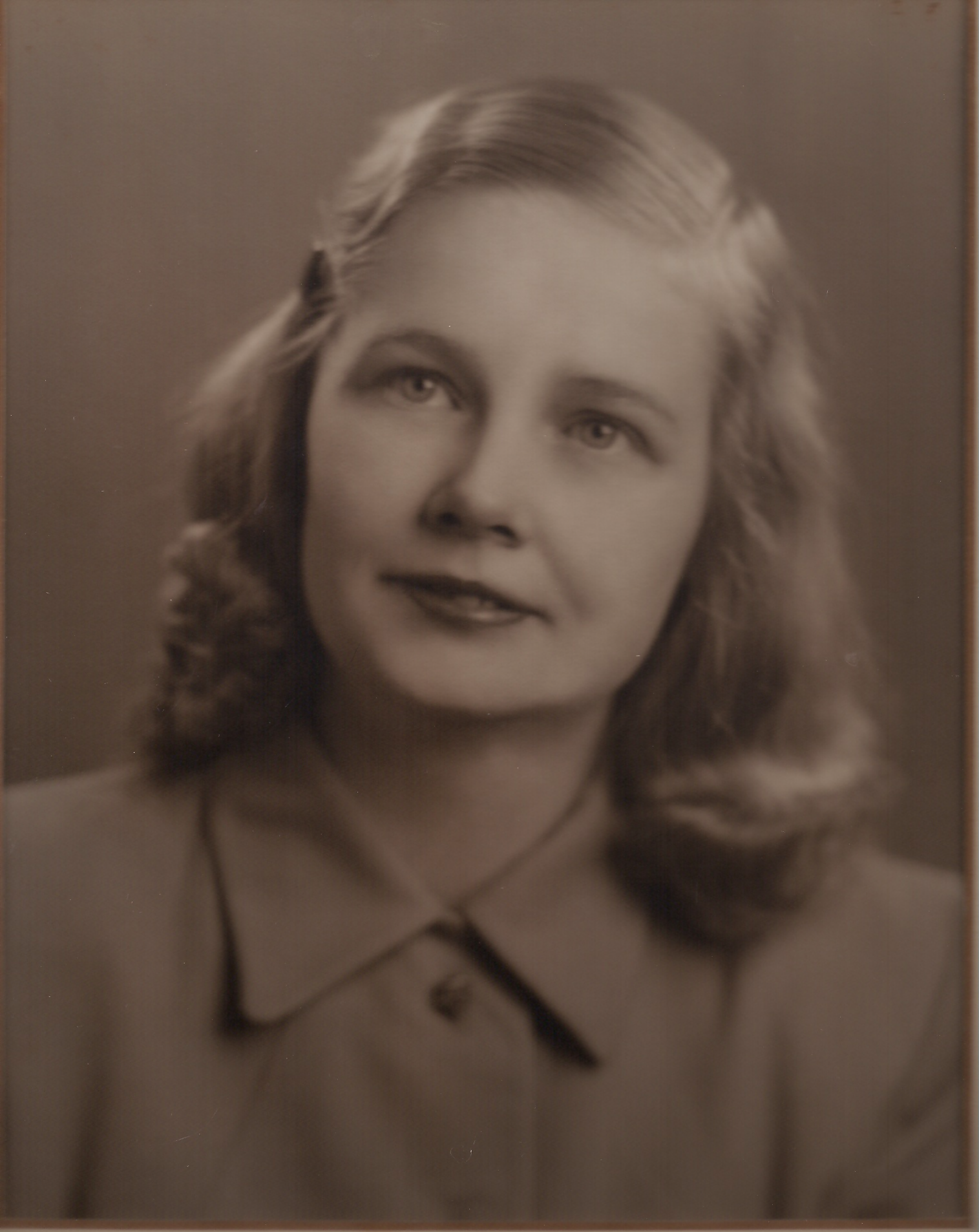 Sepia-toned portrait of a woman with shoulder-length wavy hair, wearing a collared shirt.