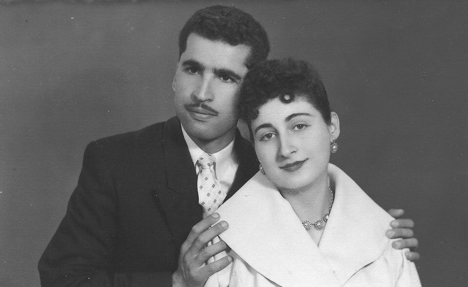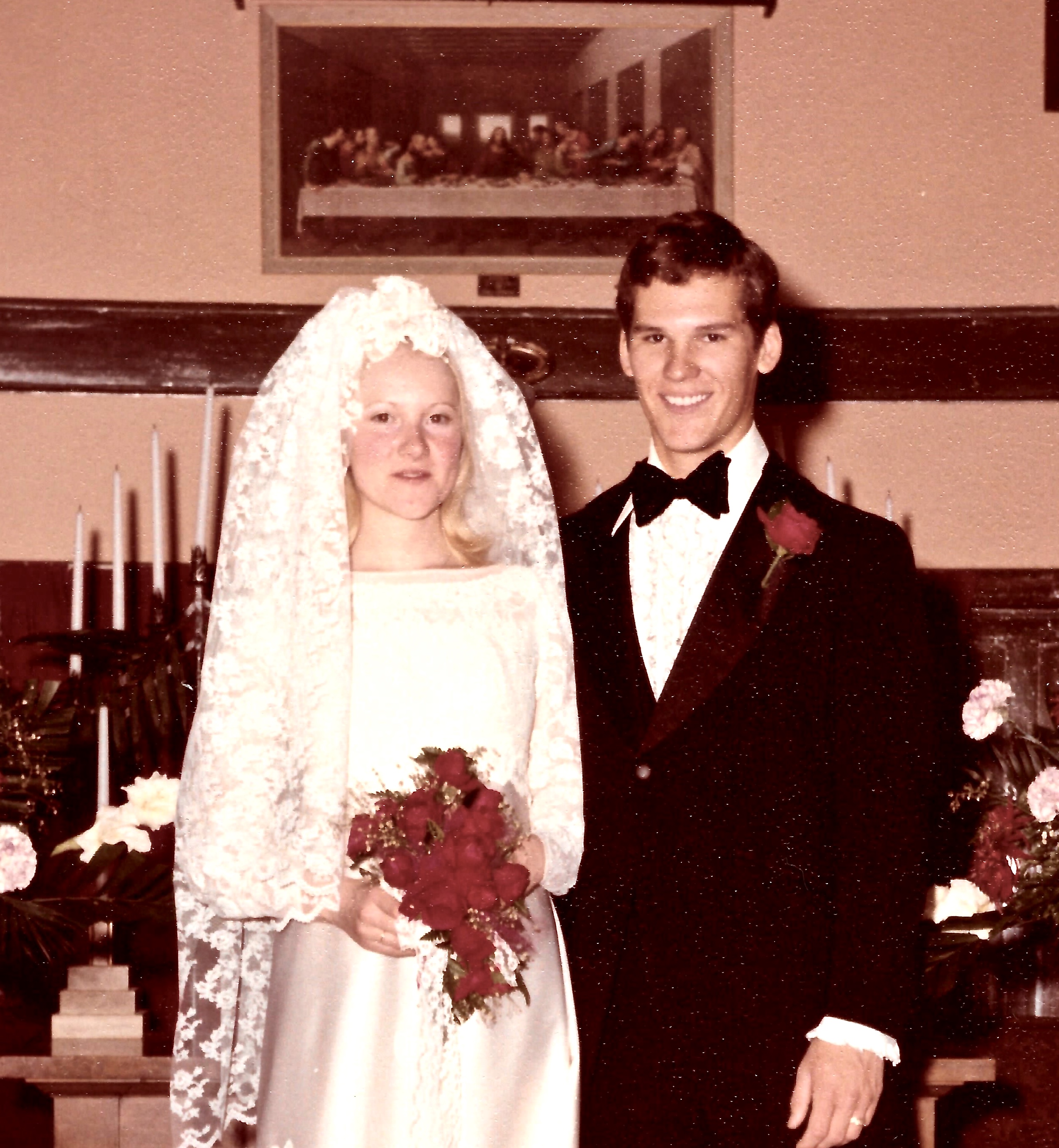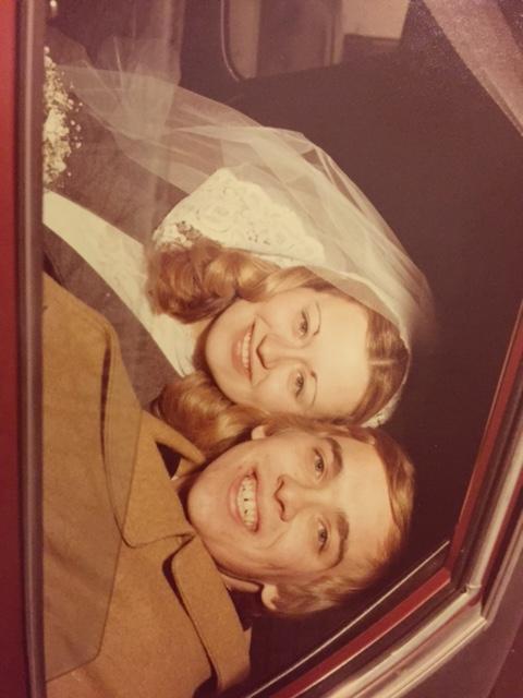 Painting of a bride and groom on their wedding day.