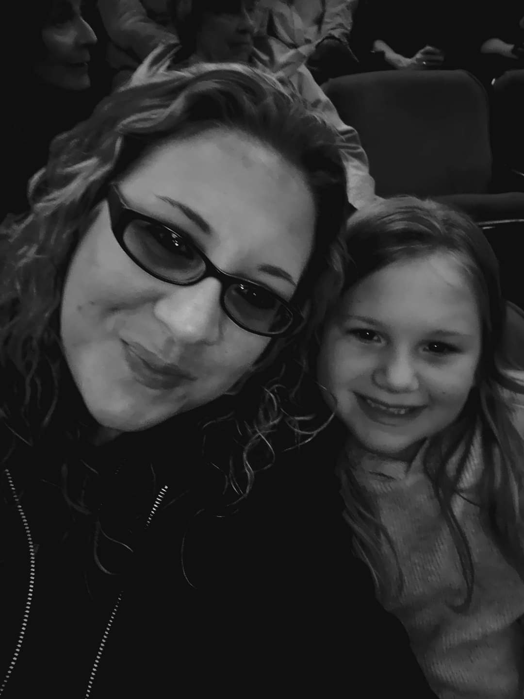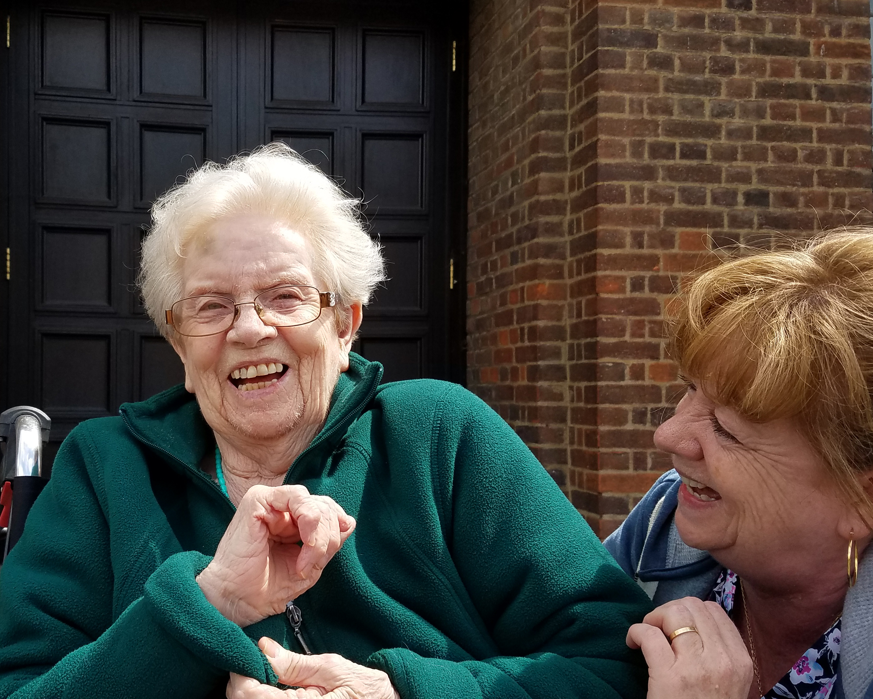 Painting of two laughing women, one older with glasses and a green jacket, the other younger with reddish hair.