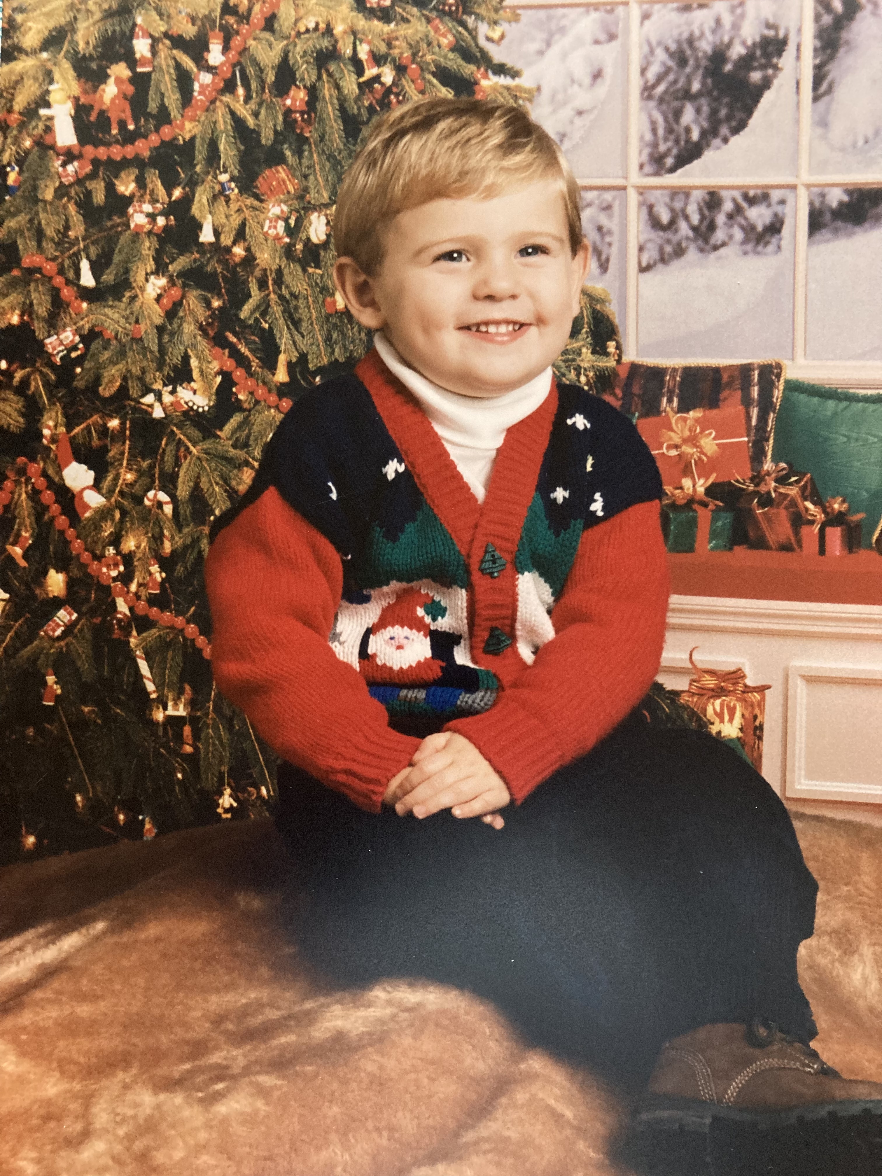 Watercolor painting of a young boy in a Christmas sweater sitting by a decorated Christmas tree.