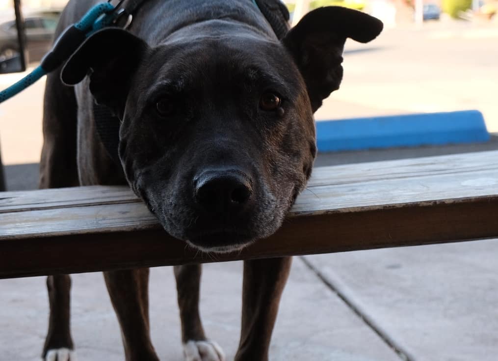 Painting of a smiling brindle and white Pit Bull terrier against a blue sky.