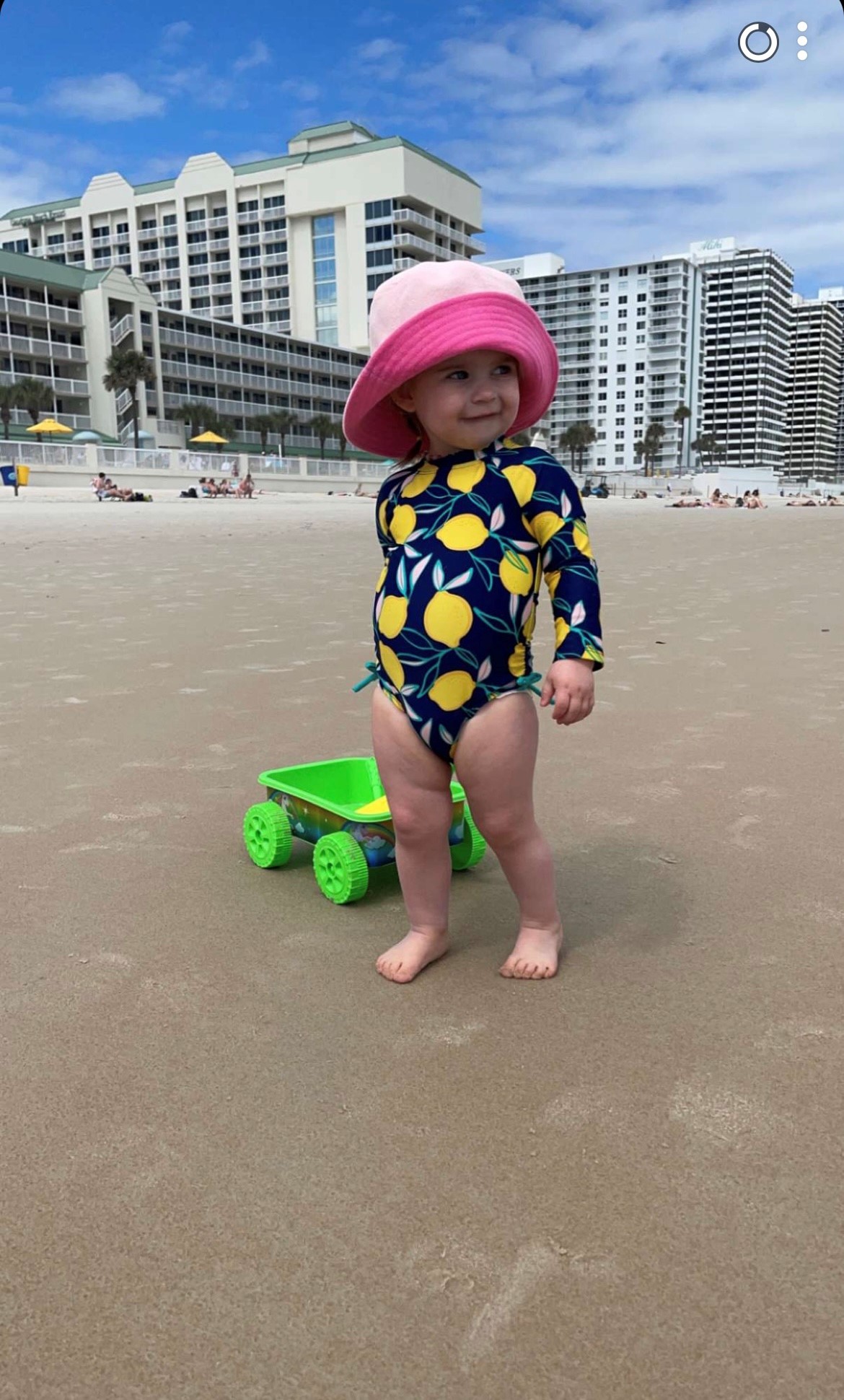 Watercolor portrait of a toddler girl wearing a pink and white sun hat and a lemon-print swimsuit.