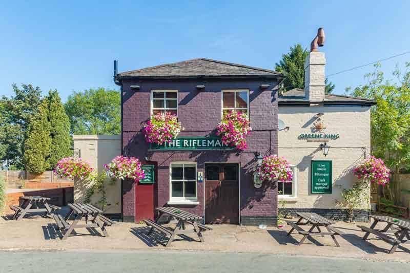 Watercolor painting of The Rifleman pub, a purple building with hanging baskets, picnic tables, and a Greene King sign.