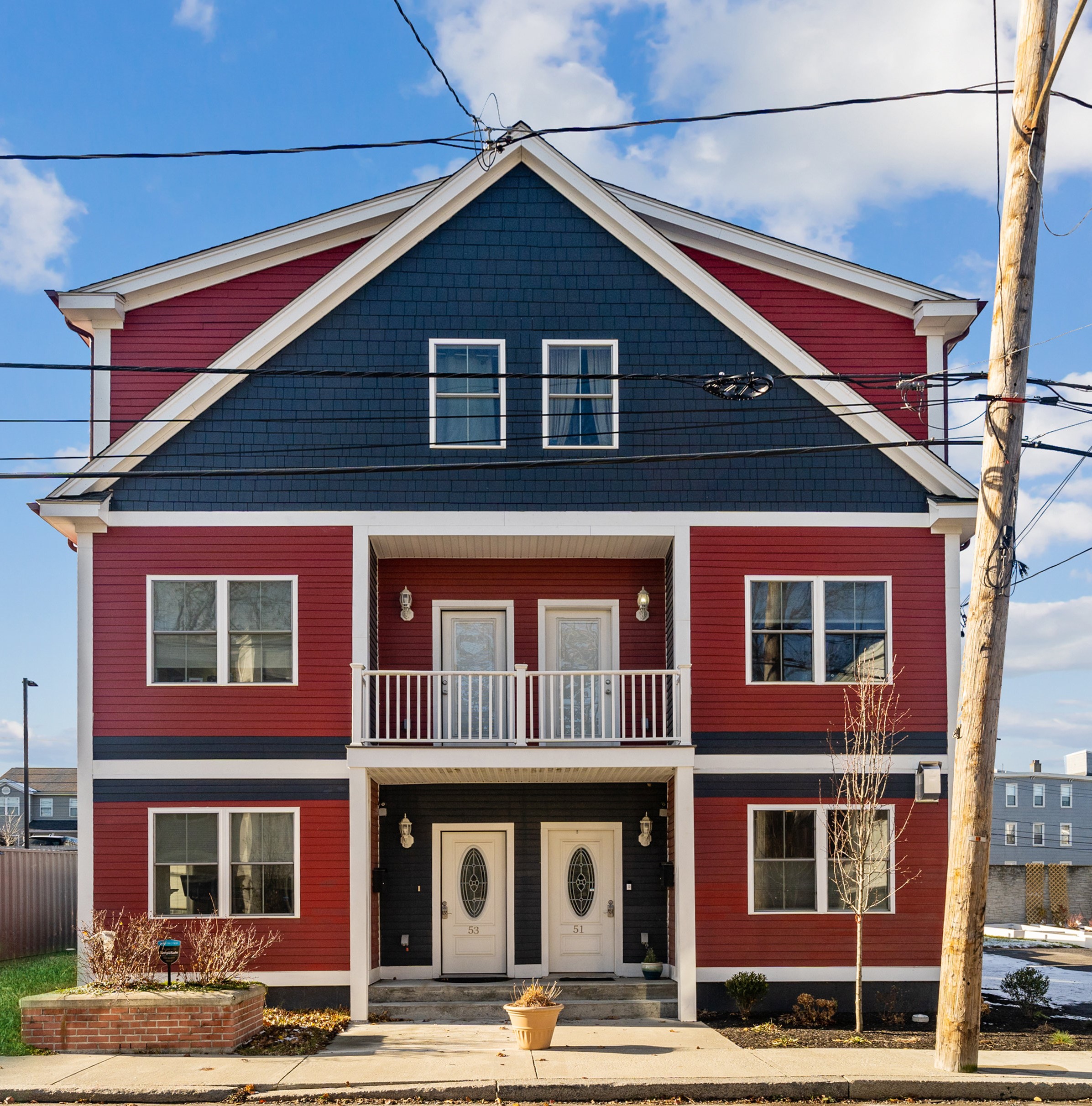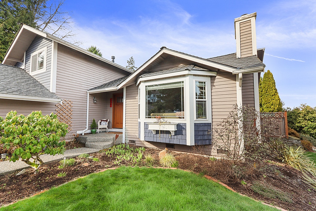 Painting of a light beige house with a bay window, orange front door, and landscaped yard.