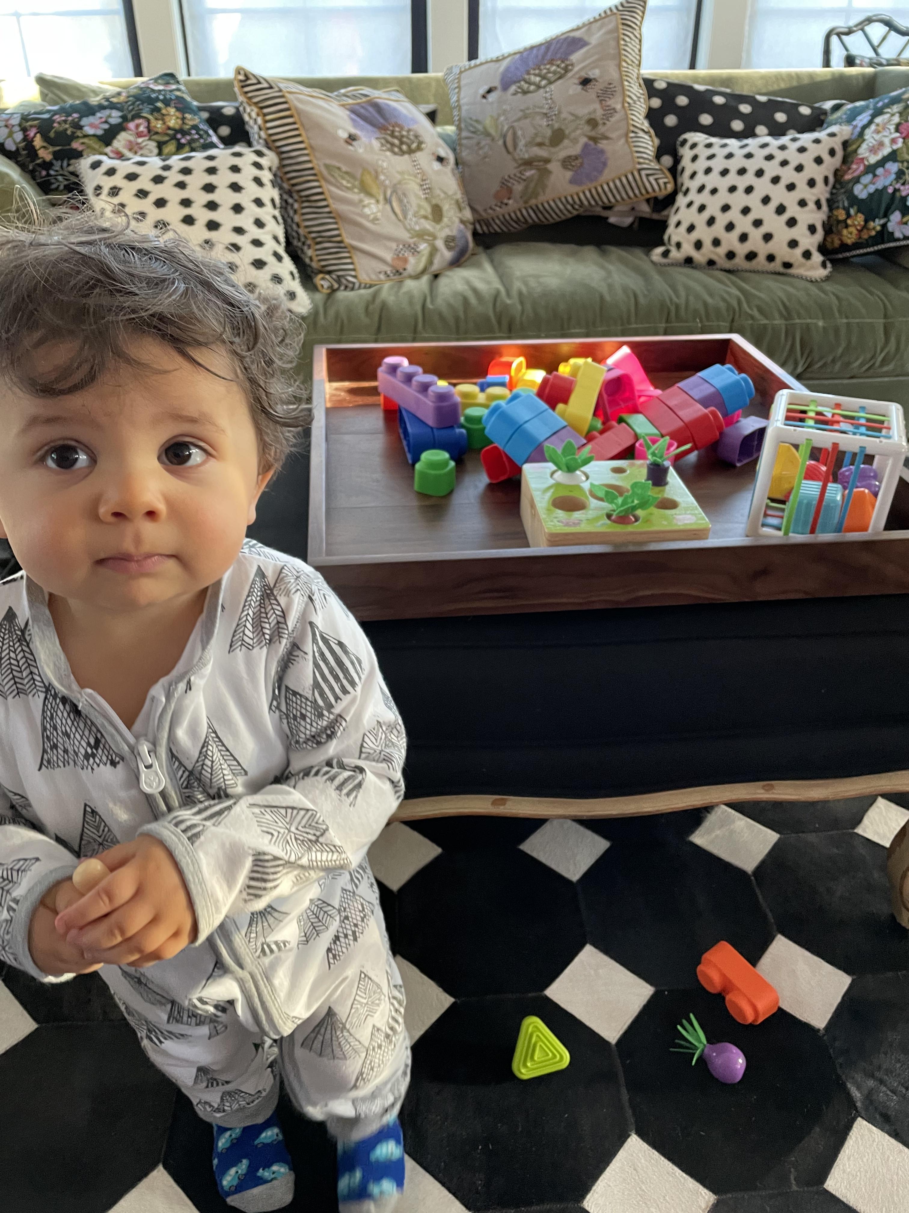 Watercolor portrait of a baby with curly brown hair wearing a light blue shirt with a geometric pattern.