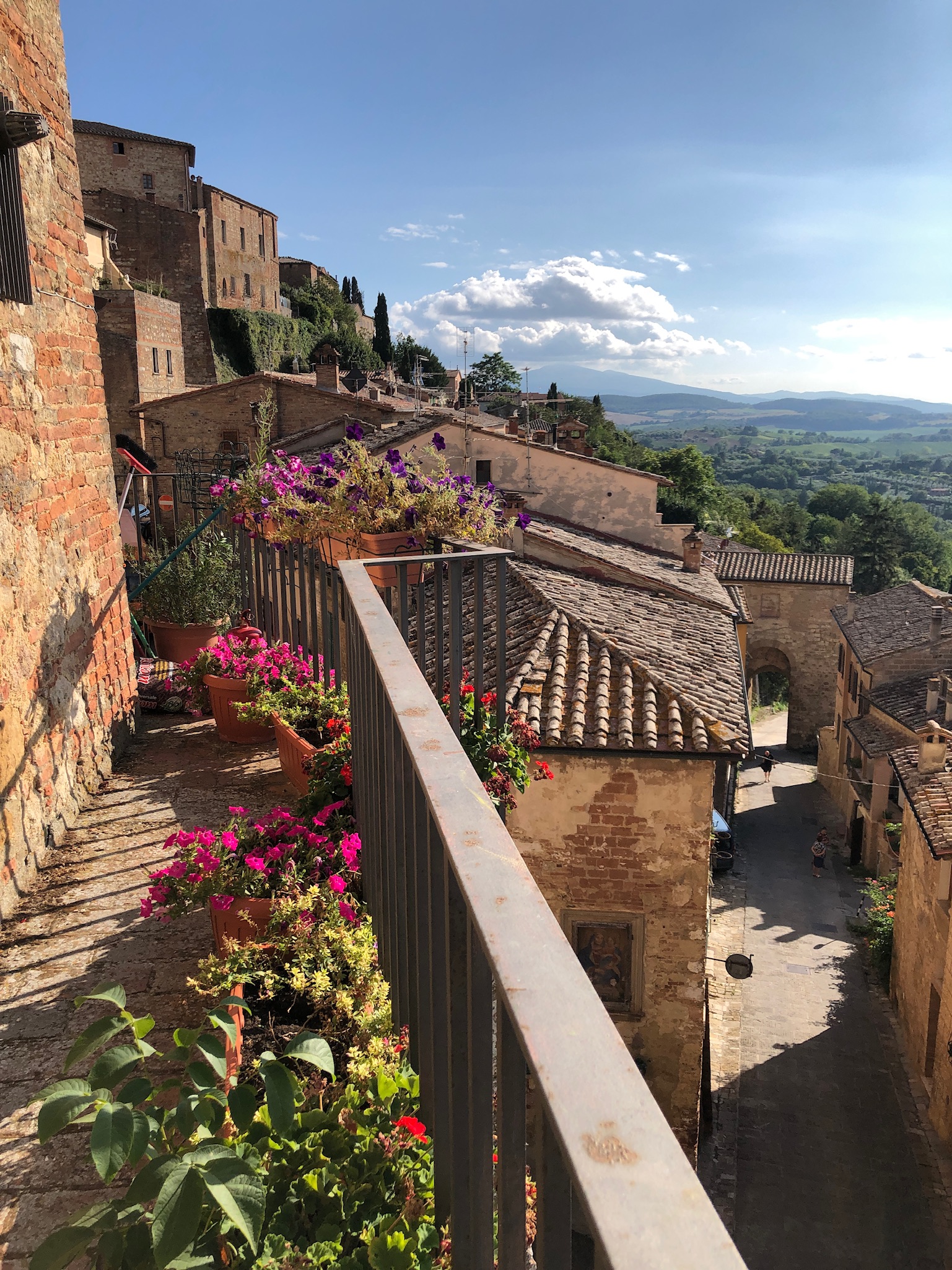 Watercolor painting of a hillside town with flower-filled balconies overlooking a valley.