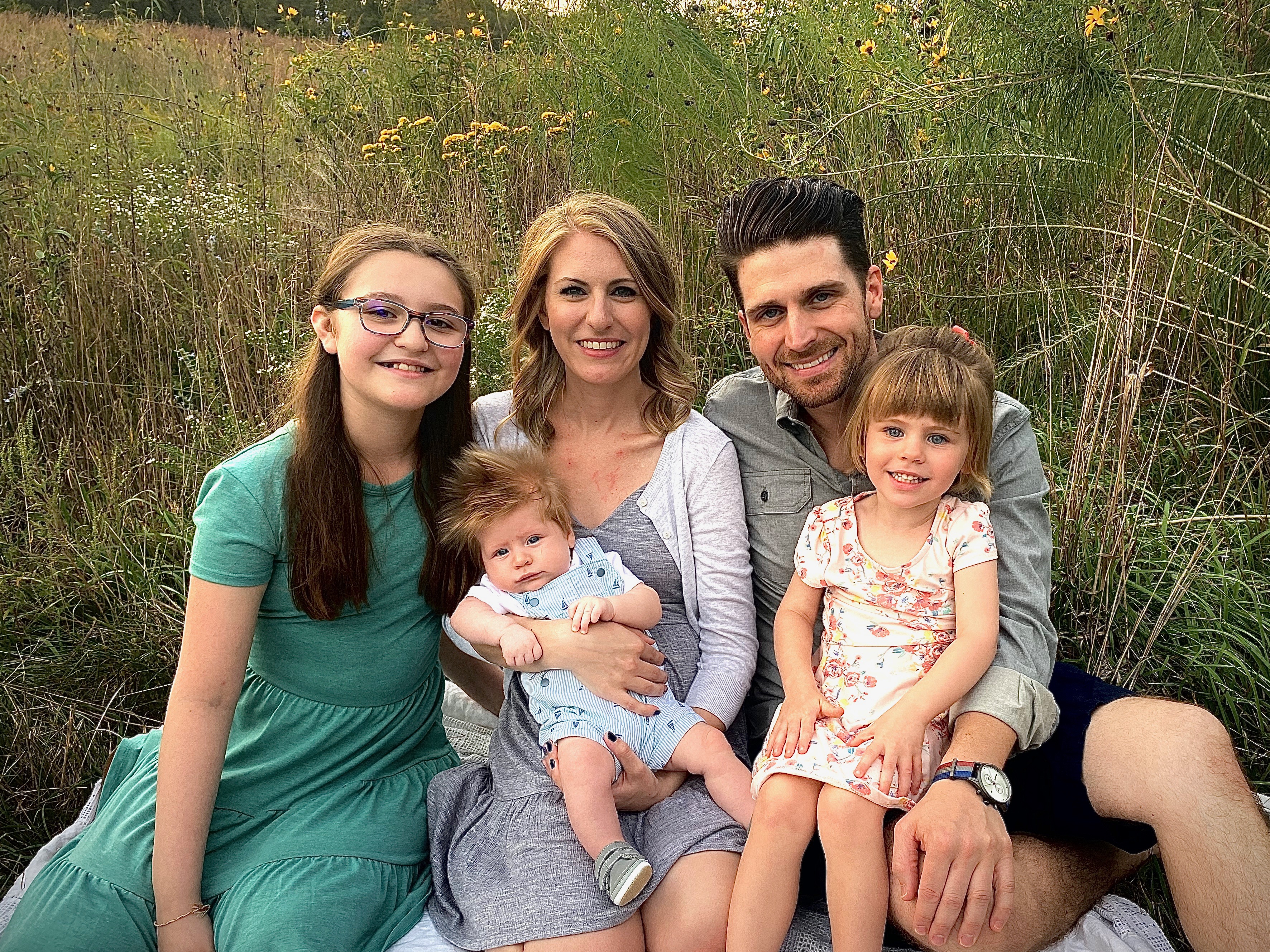 Watercolor portrait of a family: two parents, a teenage daughter, a toddler, and a baby.