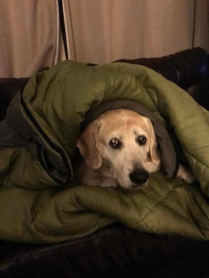Watercolor painting of a happy yellow Labrador Retriever in the grass.