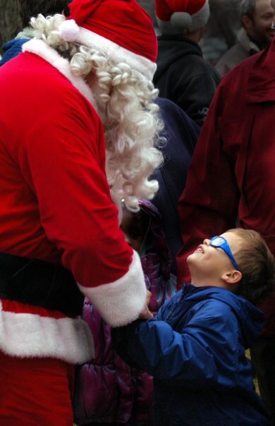 Watercolor painting of Santa Claus and a boy looking at a Christmas tree.