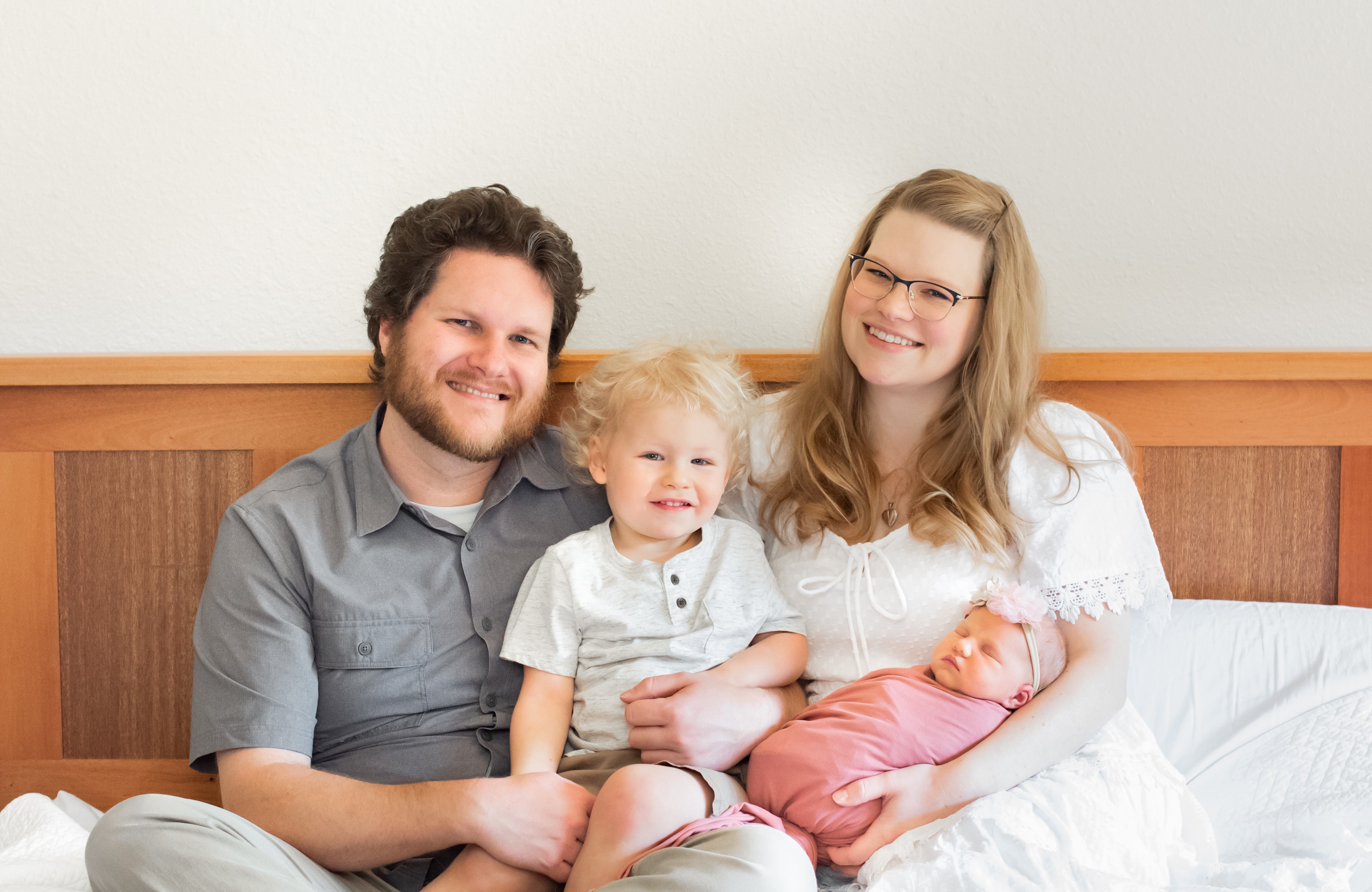 Watercolor portrait of a family: father, mother, toddler, and newborn baby.