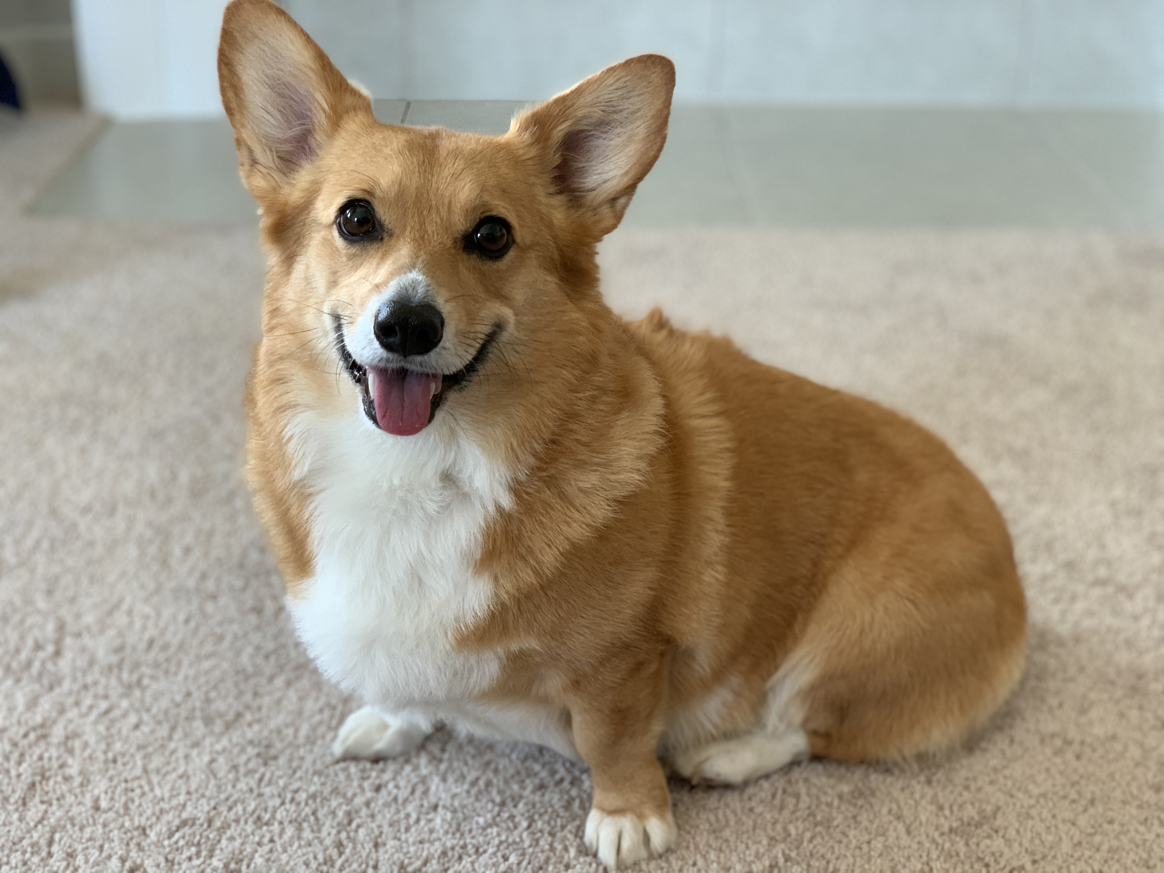 Watercolor painting of a smiling corgi.