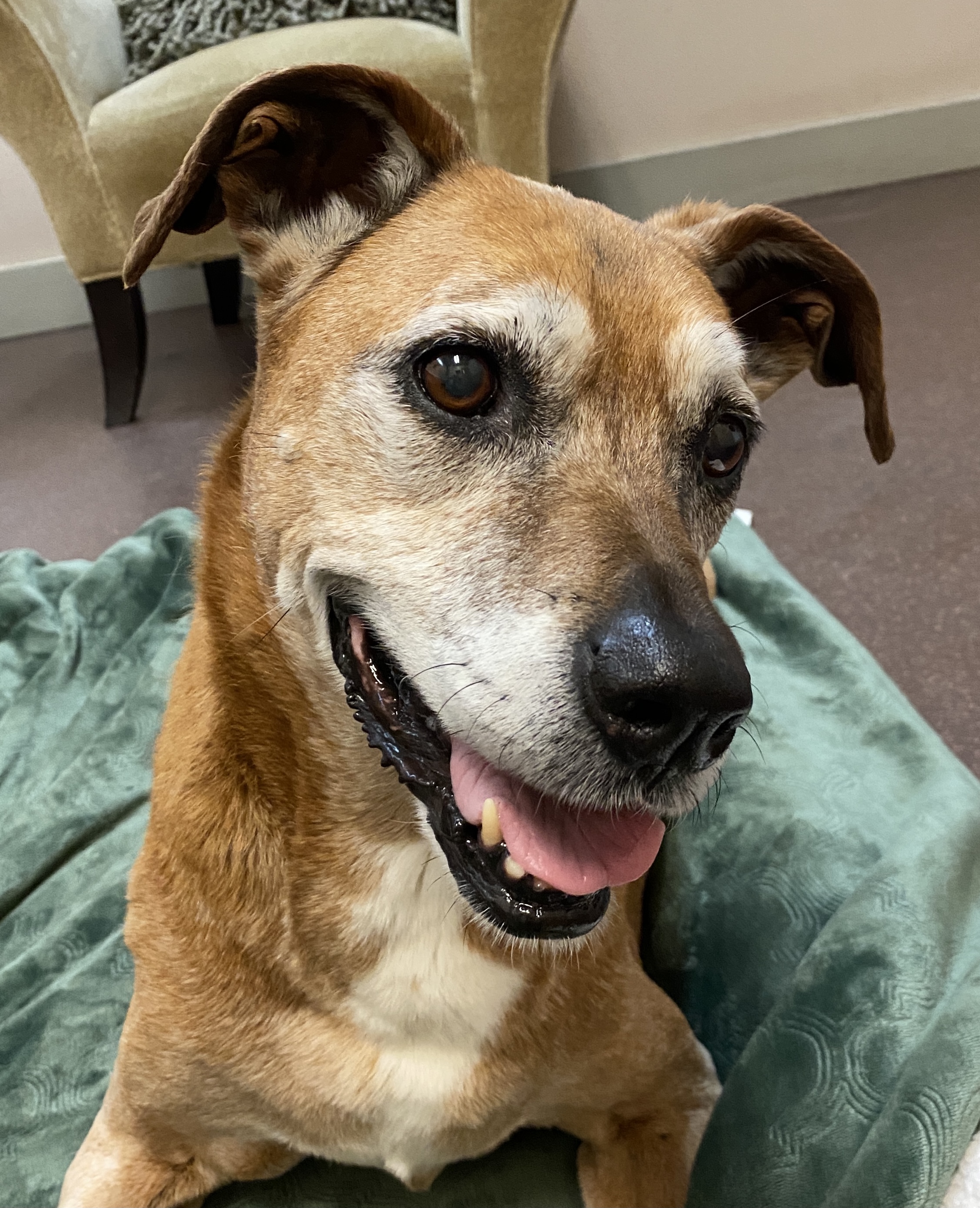 Watercolor portrait of a happy brown dog with its tongue out.