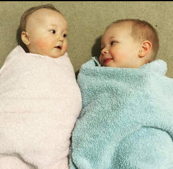Watercolor painting of two babies wrapped in blankets, looking at each other.