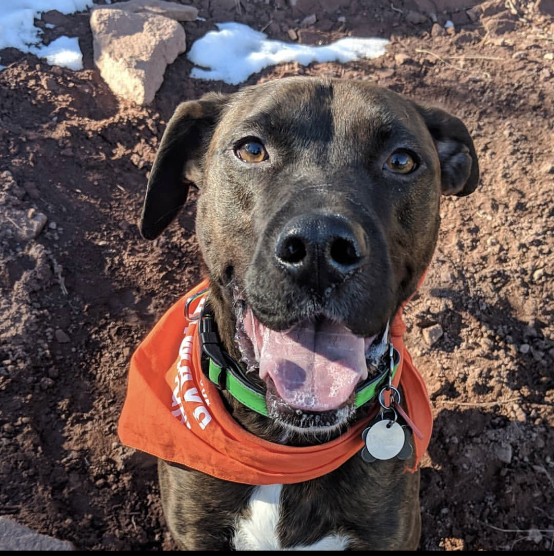 Watercolor portrait of a brown dog wearing an orange bandana and green collar.
