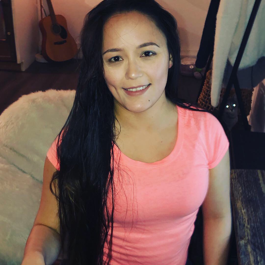 Watercolor portrait of a smiling woman with long black hair wearing a peach-colored shirt.