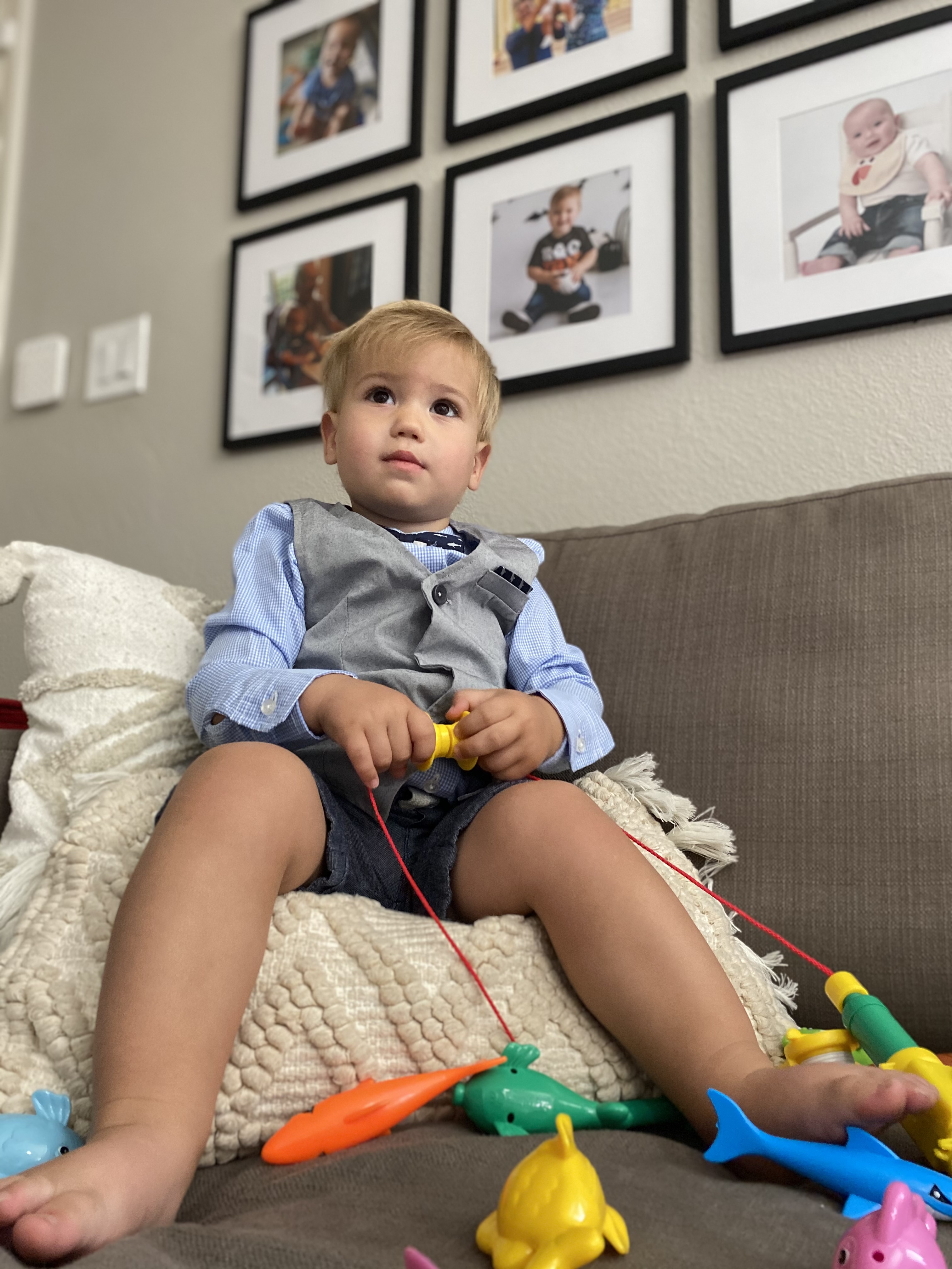 Watercolor painting of a woman and toddler watching the ocean from a beachside patio.
