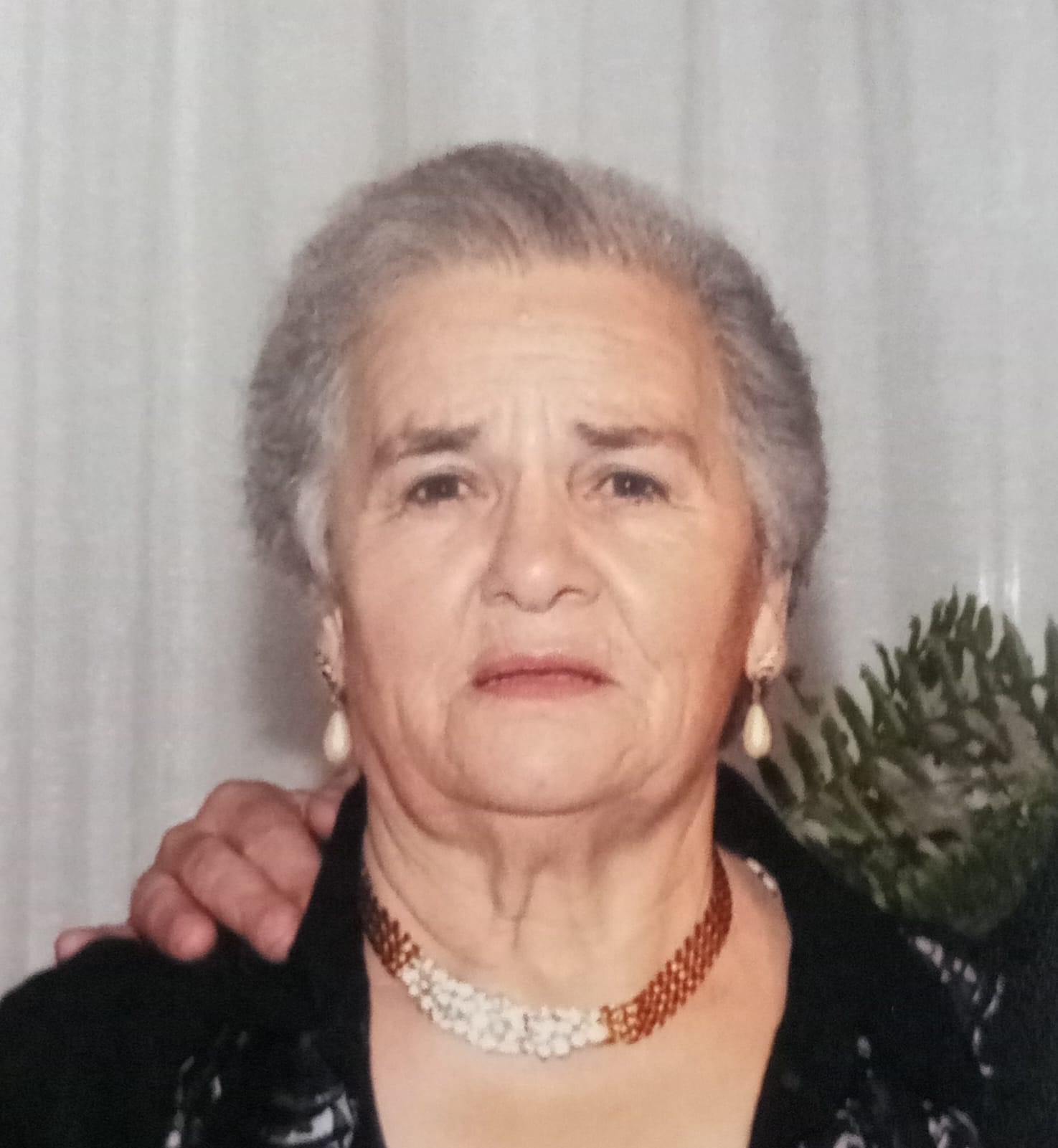 Portrait of an older woman with gray hair, wearing a pearl necklace and earrings.
