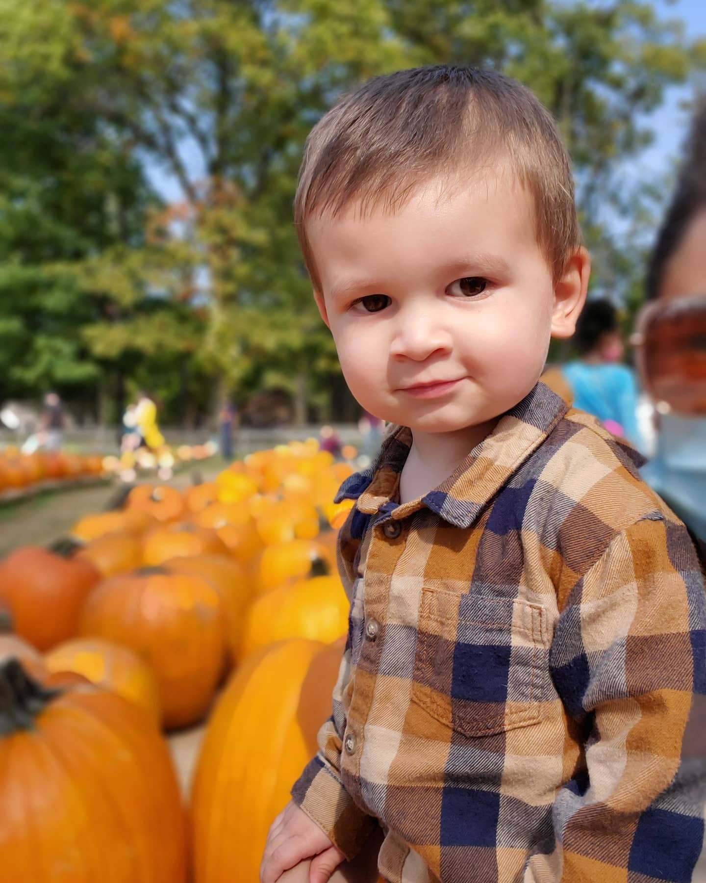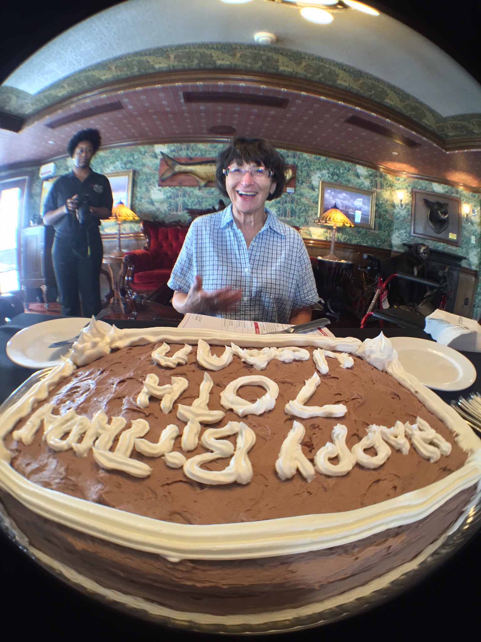 Watercolor portrait of a smiling woman wearing glasses and a blue plaid shirt, with a fish painting visible in the background.
