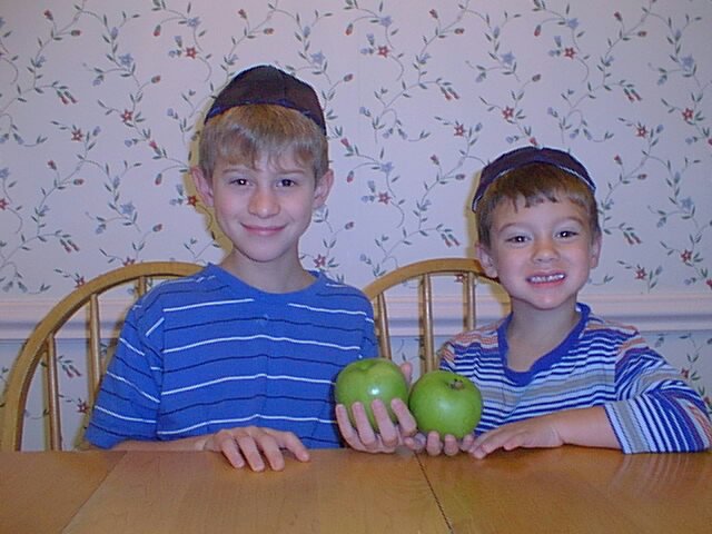 Watercolor portrait of two boys wearing yarmulkes, holding green apples.