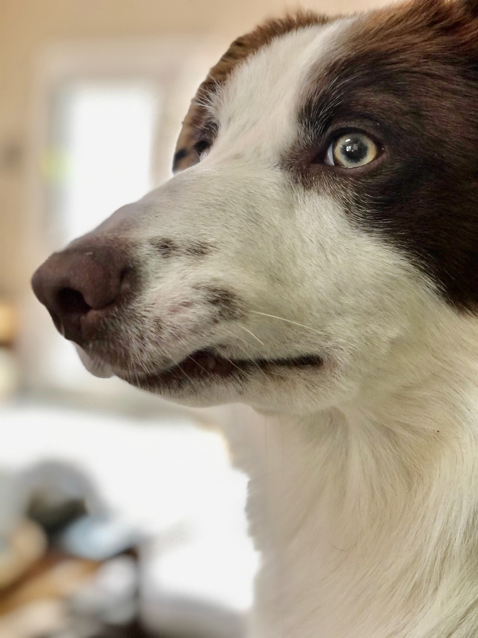 Watercolor painting of a dog`s head and shoulders amongst cosmos flowers, against a blue sky.