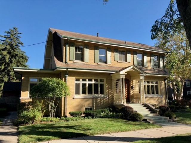 Watercolor painting of a two-story tan house with green shutters and a front porch.