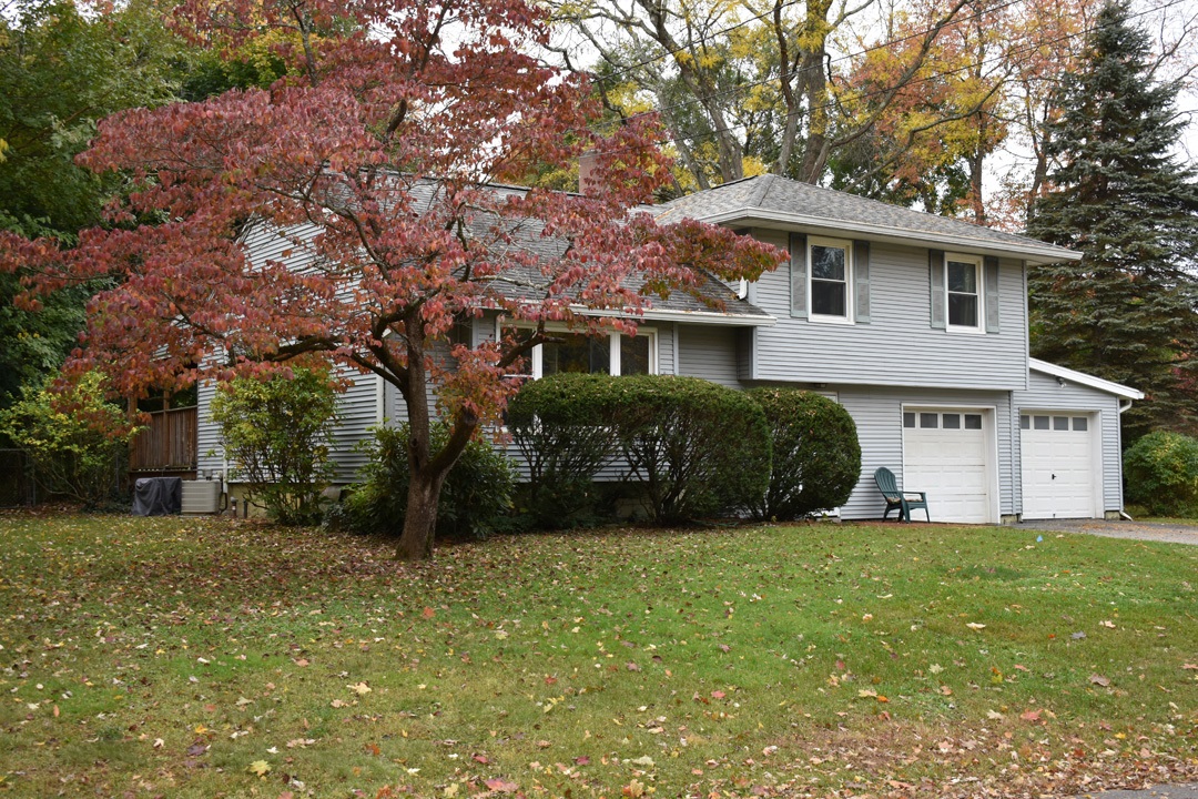Watercolor painting of a light purple house with a two-car garage and autumn foliage.