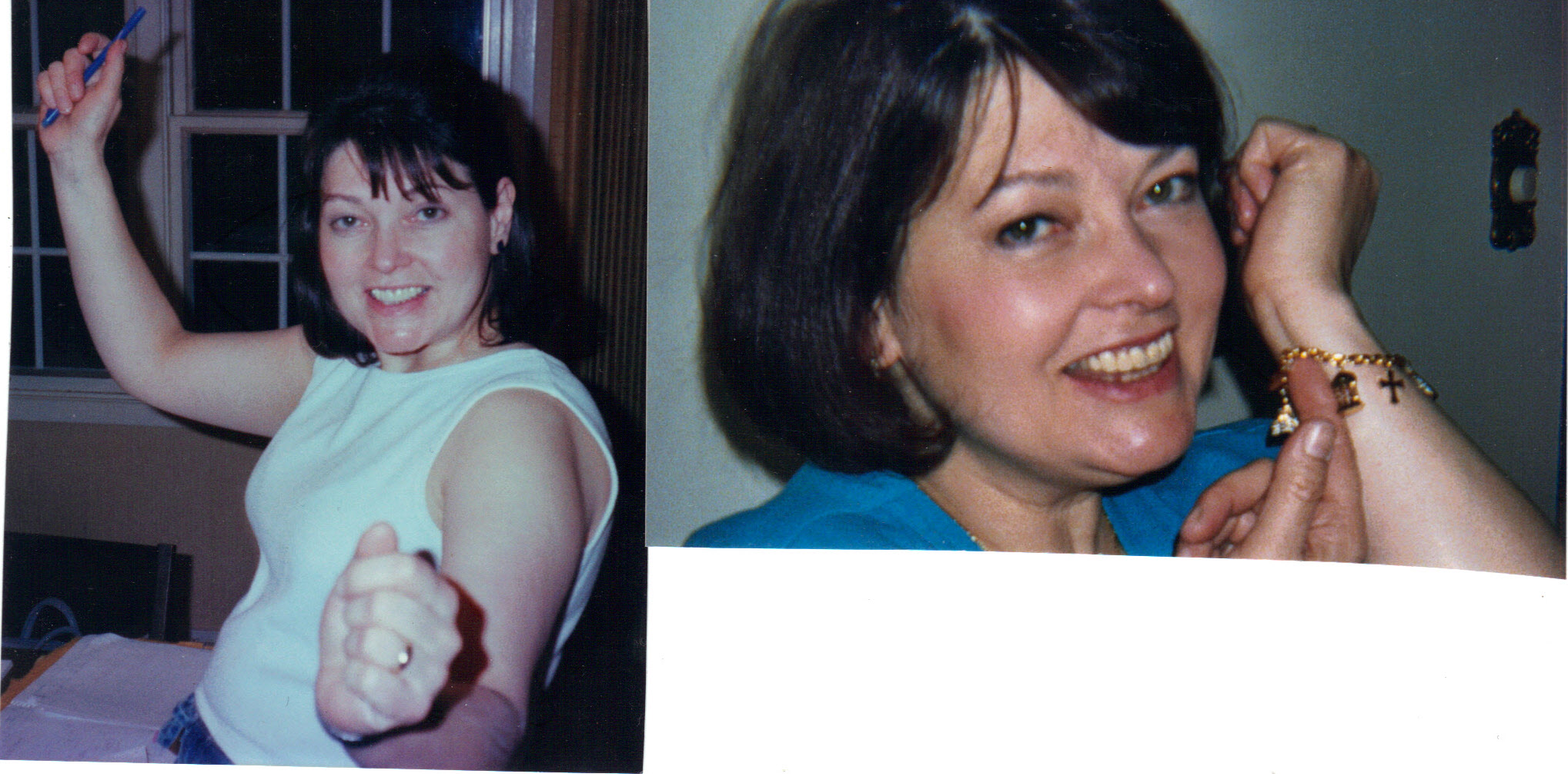Watercolor portrait of a smiling woman with short dark hair, wearing a teal shirt, and showing off a beaded bracelet with a cross.