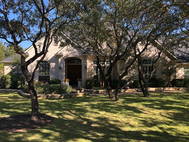 Painting of a light beige house with a large front door, surrounded by trees and a lawn.